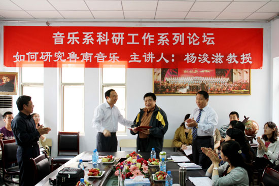 曹胜强在讲话中对音乐系的科研工作表示肯定,对下一步的科研工作从宏观上提出了三点指导性意见:一是要求音乐系教师的科研工作要与教学紧密结合,以教学促科研,以科研成果服务教学;二是要注重文化、精神领域的研究,侧重鲁南民间音乐的挖掘整理,如民歌、民谣、民乐、民曲等,以鲁南音乐研究所为平台,带出一支高水平的学术科研队伍;三是要注重文献资料的搜集、检索、整理并深入研究,借运河文化研究,推出一批有影响的科研成果。随后,曹院长为杨浚滋教授颁发了鲁南音乐研究所名誉所长证书。