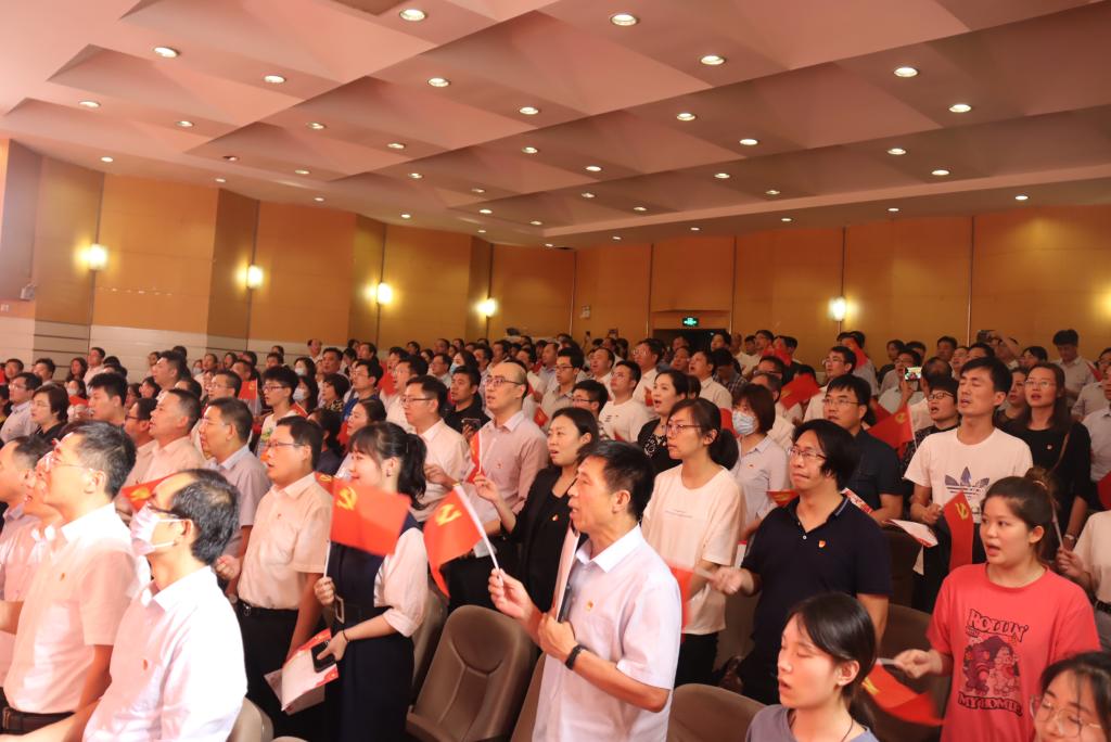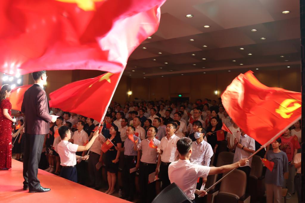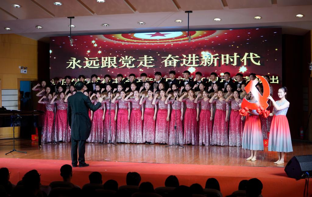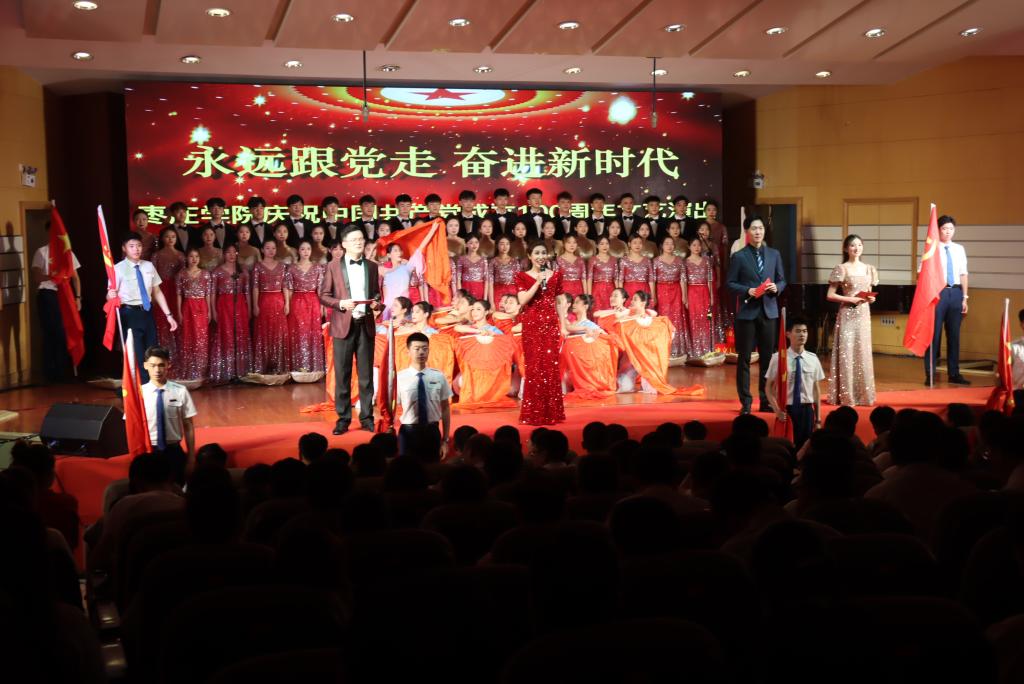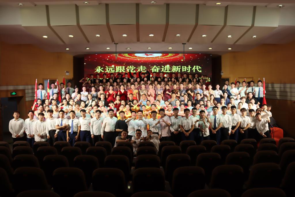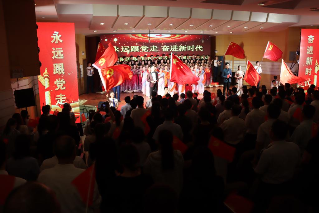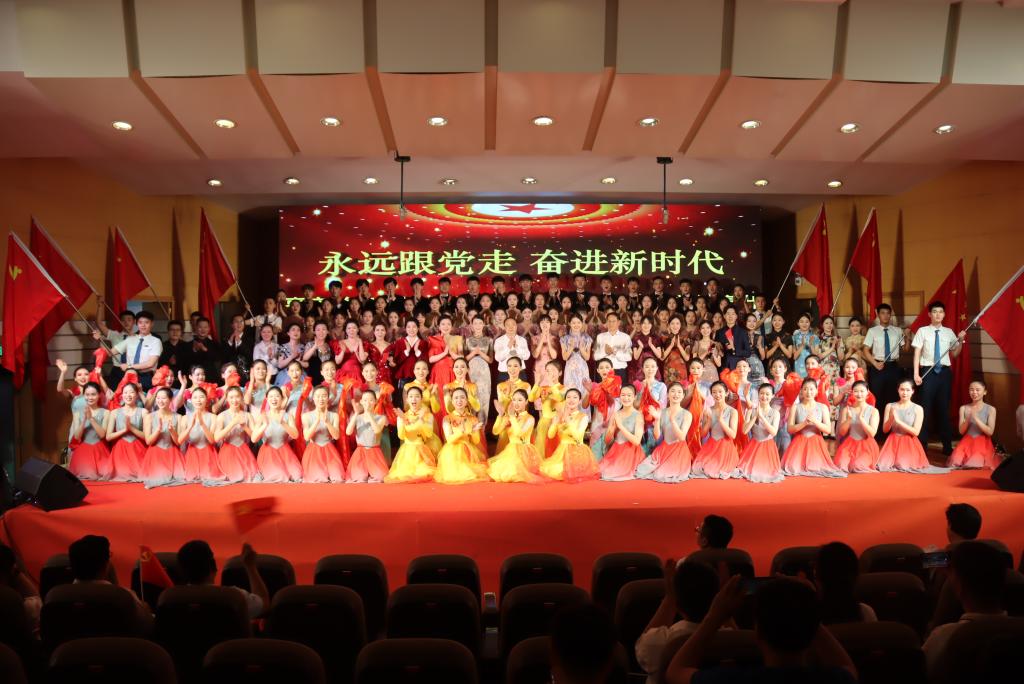 现场,歌声、掌声如潮。师生们的歌声或旋律激昂、气势澎湃,或婉转悠扬、韵味典雅,辅以绚丽多彩的服装和舞台设计,融合优美的舞蹈表演为观众奉上了一场精彩的视听盛宴。嘹亮的歌声回荡在上空,台上演员们深情放歌,台下观众也情不自禁地跟着一起唱和。演出最后,雄壮激昂的音乐再次响起,全体人员一起挥舞手中的党旗,学校领导走上舞台,带领现场师生齐声高唱《没有共产党就没有新中国》,用歌声抒发着对党的感恩之情和庆祝建党百年华诞的喜悦之情,也唱出了担当新使命、奋进新时代的最强音。