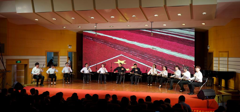 音乐厅灯光璀璨,洋溢着浓浓的喜庆氛围。演出在枣院师生《唱支山歌给党听》MV的经典旋律中拉开帷幕。随后,一首首动人的红歌、一段段深情的朗诵,或慷慨激昂,或娓娓动听,在满怀深情中表达出对我们党光辉历史的真情歌颂。