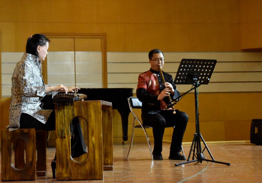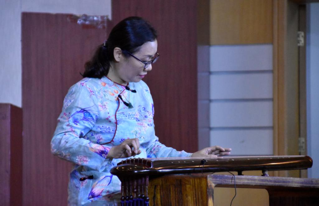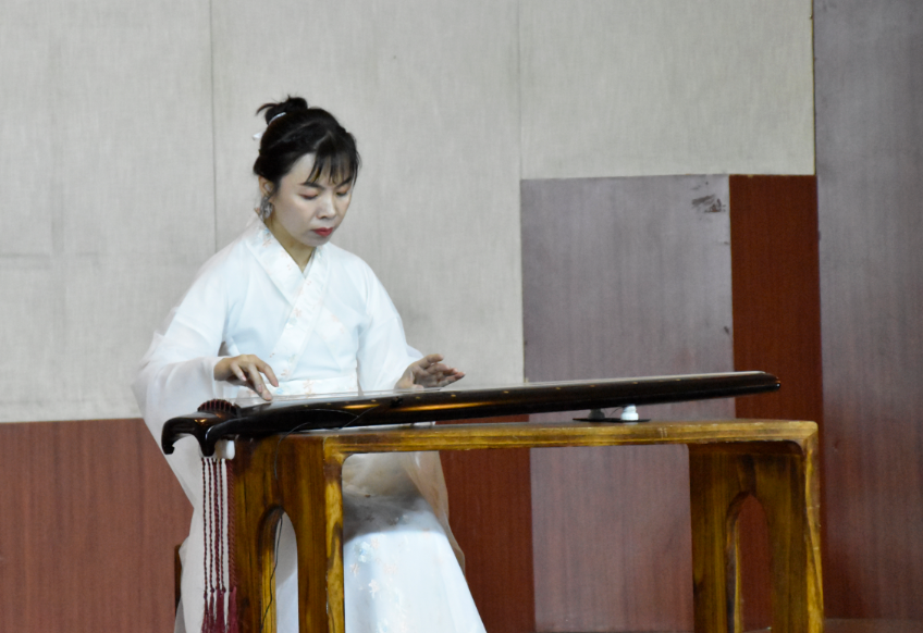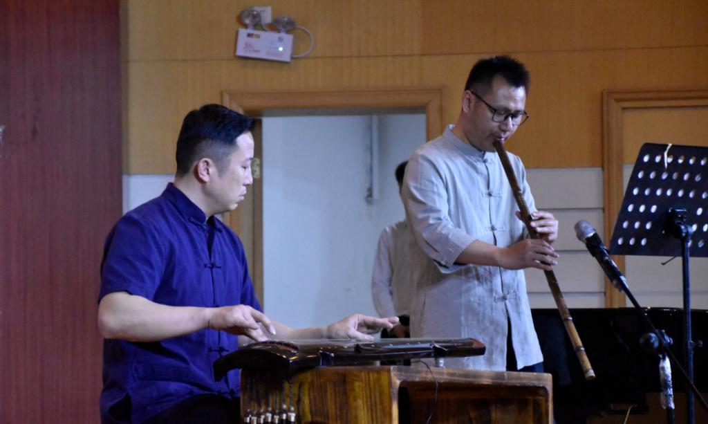 琴声乍起,朔风萧萧。琴箫合奏《卧龙吟》、《普庵咒》,清扬婉转,在古琴乐中含光隐耀,和光同尘,交织出古朴圆润的乐章。古琴独奏曲《梅花三弄》,此曲古淡清幽的曲调展现梅花玉骨冰肌,独自盛开之风情,堪称千古梅花之绝唱。赵燕老师所演奏的《流水》,曲中流水时而活泼潆洄、若幽涧鸣泉,喻示着大自然生命力的延伸与永恒。本场古琴演奏淋漓尽致地展现了各位老师深厚的演奏功力。