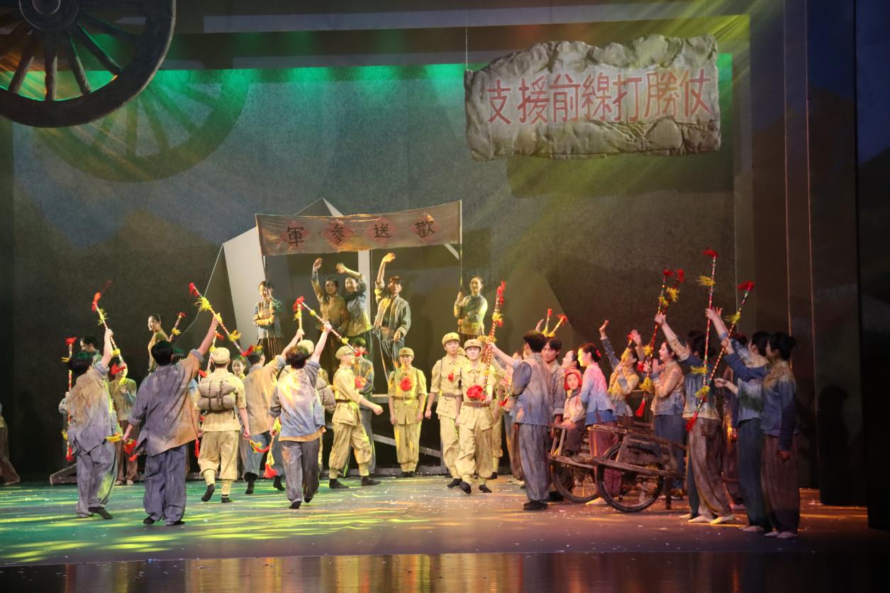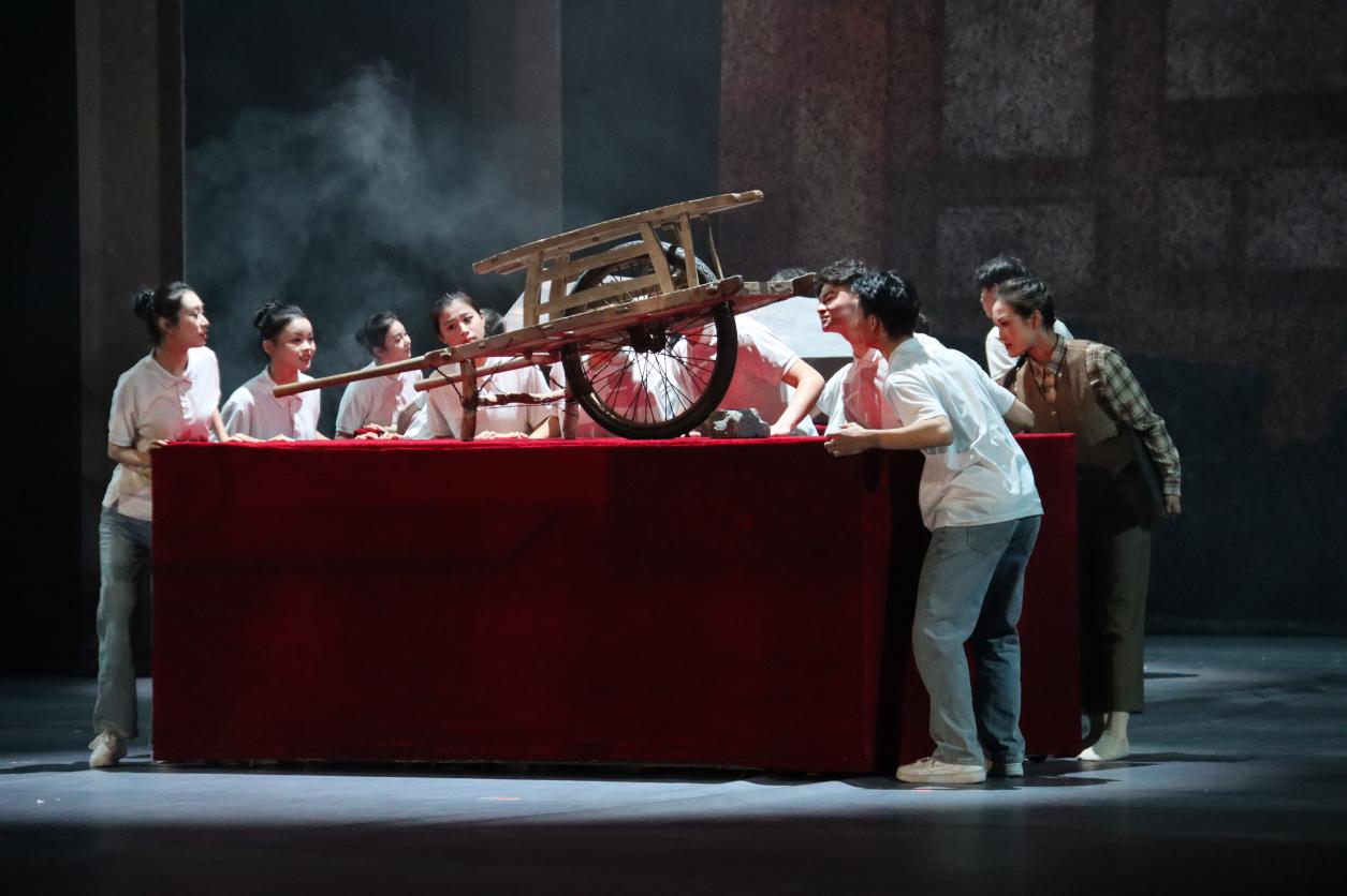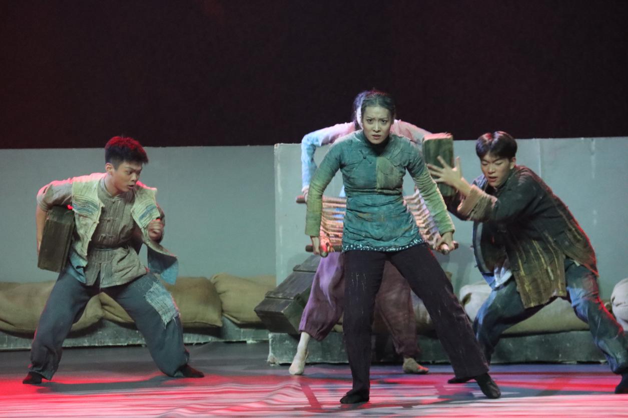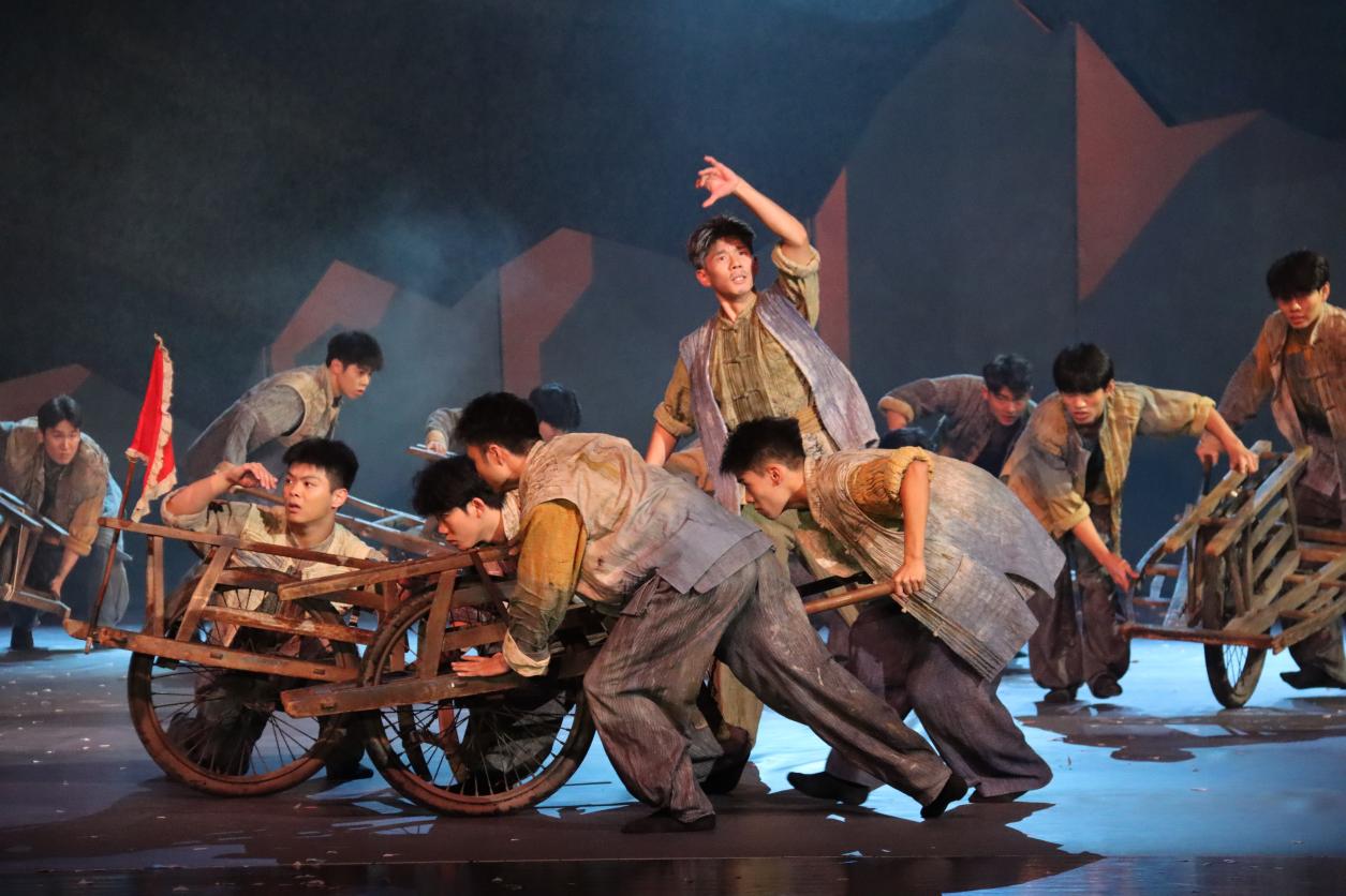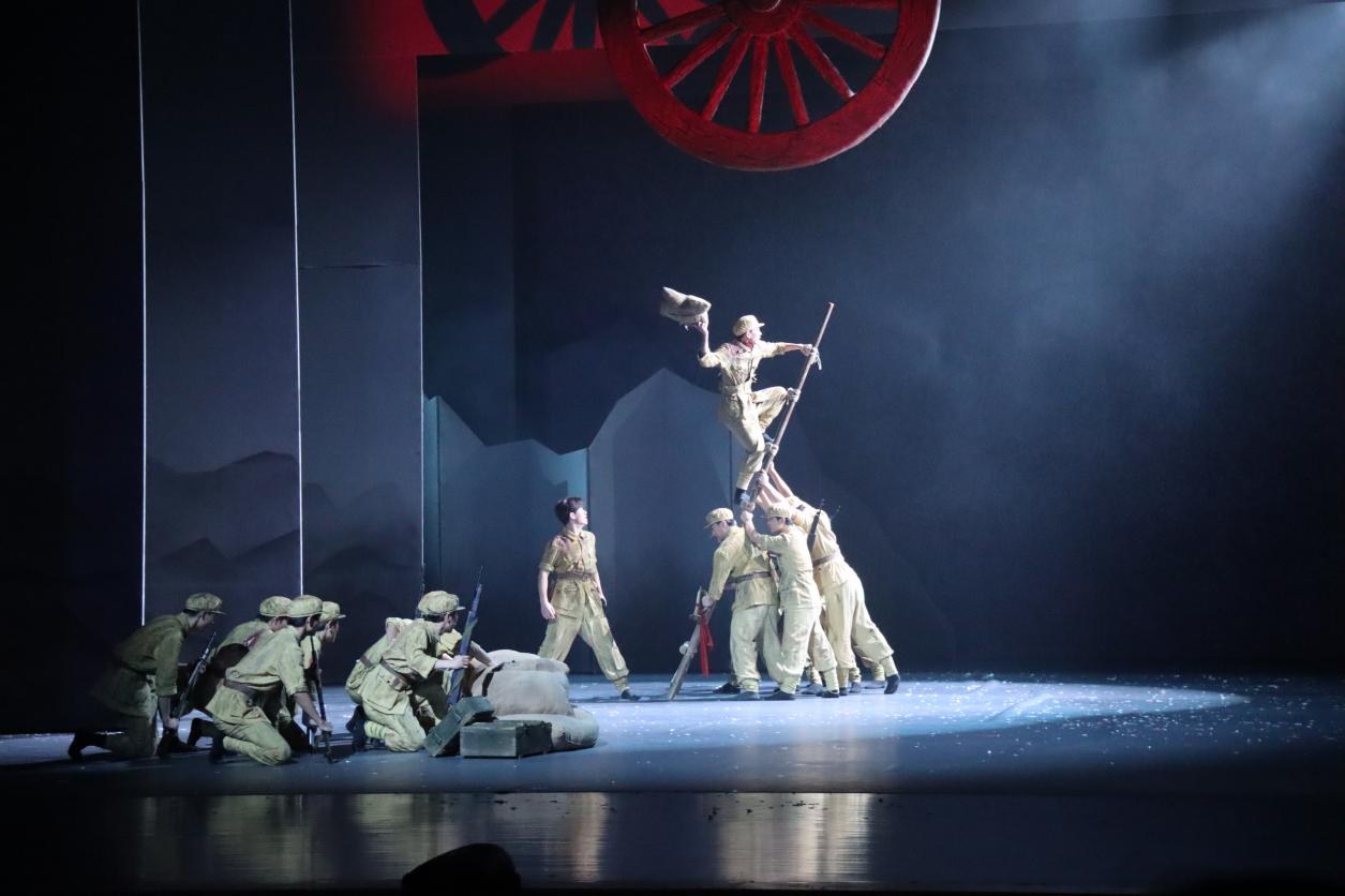 舞剧《沂蒙长风》以沂蒙革命老区的真实历史为根基,以刘永良一家人的感人故事为原型,巧妙融合李桂芳、梁怀玉等沂蒙英模的典型事迹,生动讲述了革命战争年代沂蒙人民义无反顾支援前线、舍生忘死奉献家国的动人篇章。作品紧扣“一门三烈士”“火线桥”等震撼人心的历史事件,以“推车支前”为主线,用灵动而富有力量的舞蹈语言,深刻诠释了“党群同心、军民情深、水乳交融、生死与共”的沂蒙精神内核。全剧精心设计序《风光》、四幕《风云》《风烟》《风涛》《风华》及尾声《长风》的完整结构,创新采用回旋曲式与“多线并进”的叙事手法,将“独轮车”、“纺车”等承载着厚重历史的革命文物转化为鲜明的舞台意象,让观众在肢体艺术的流转中,直观感受信仰的温度与情感的共鸣。演出中,灯光、舞美与多媒体影像的巧妙融合,既营造出战争年代的宏阔背景,又细腻勾勒出人物的情感世界,打造出沉浸式的观演空间,让红色文化的崇高感与震撼力直抵人心。