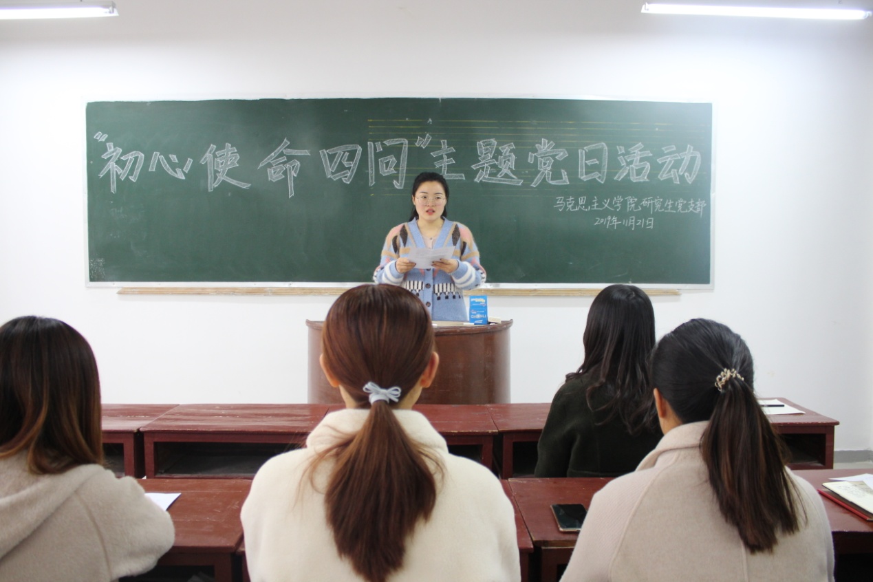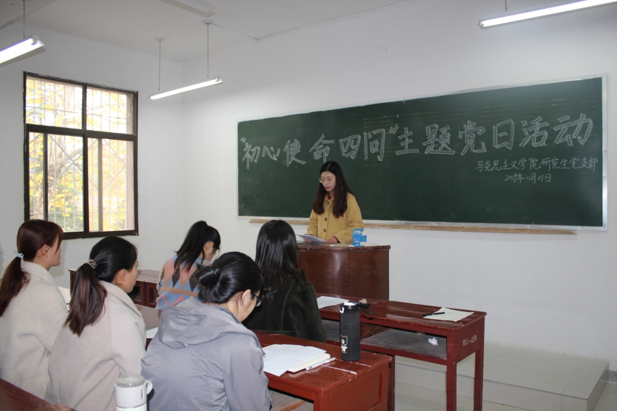 为推进“不忘初心、牢记使命”主题教育的深入开展,引导支部党员牢记理想信念,做到初心不改、使命在肩、主动作为,11月21日下午,世俱杯官网研究生党支部在教五楼201教室开展了“初心使命四问”主题党日活动,支部党员认真参加。活动由支部副书记李频捷主持。