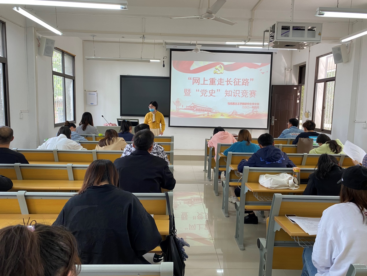 为深入贯彻落实习近平总书记在党史学习教育动员大会上的重要讲话精神,引导广大党员同志感悟百年辉煌党史,坚定理想信念。4月27日下午,在教五203教室世俱杯官网研究生党支部开展“网上重走长征路”暨“党史“知识竞赛答题活动,支部全体党员、入党积极分子参加此次活动,活动由支部书记郑晨霞老师主持。