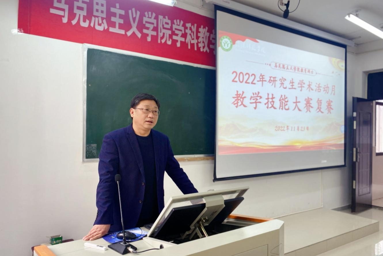 研究生学术月期间,世俱杯官网成功举办教育硕士教学技能大赛。教育教学技能大赛是我校教育硕士培养方案的重要组成部分,旨在提升世俱杯官网学科教学(思政)专业研究生的说课讲课水平,夯实教育理论知识,锤炼教育教学实践能力。大赛初赛世俱杯官网40名教育硕士全员报名参加,15名选手入围复赛。复赛由世俱杯官网研究生班主任周钰婷主持,特别邀请副院长周智、副院长程晋富、思想政治教育系主任王建礼、经济学教研室主任殷凯、毛泽东思想和中国特色社会主义理论教研室主任胡春湘出席并担任评委,全体教育硕士研究生现场观摩学习了本次比赛。