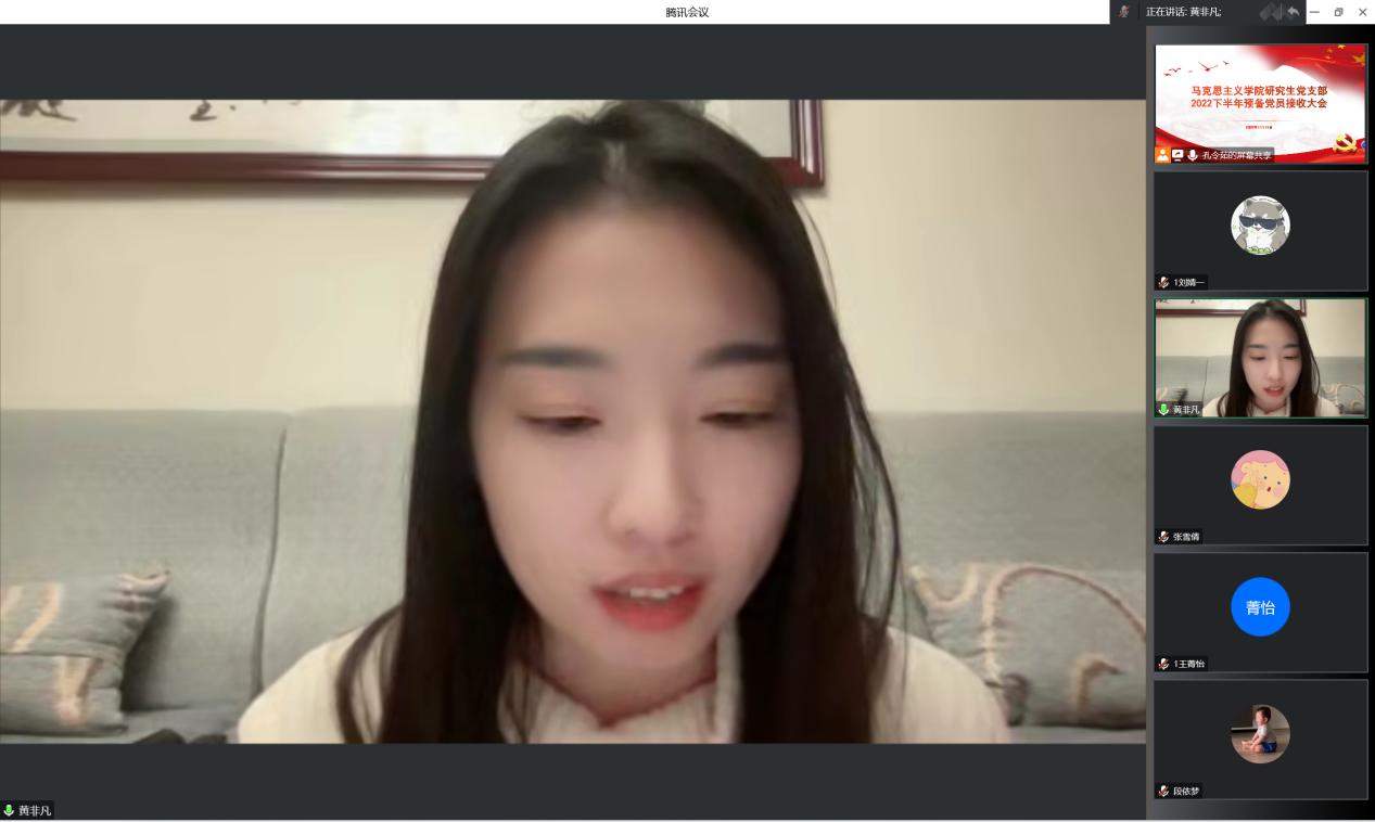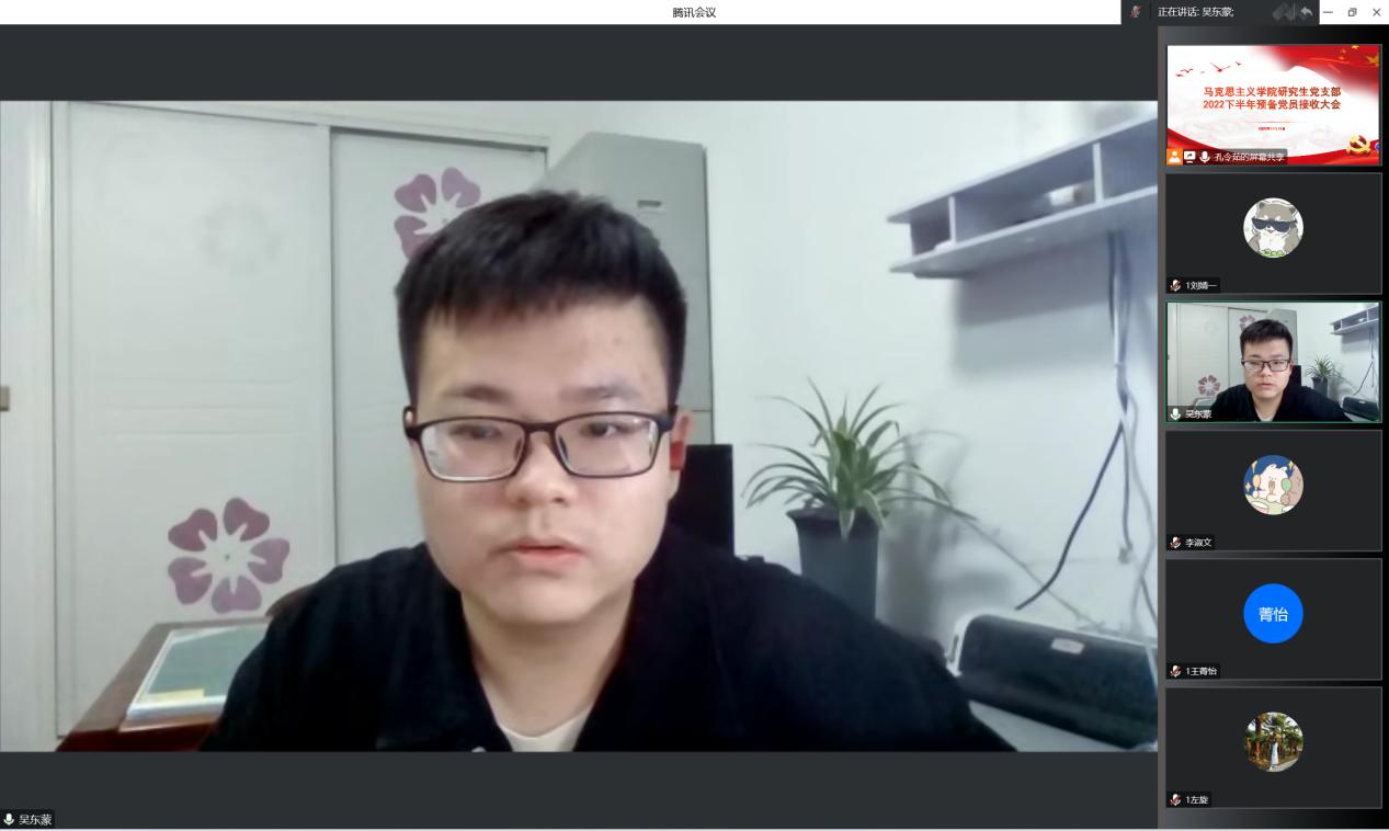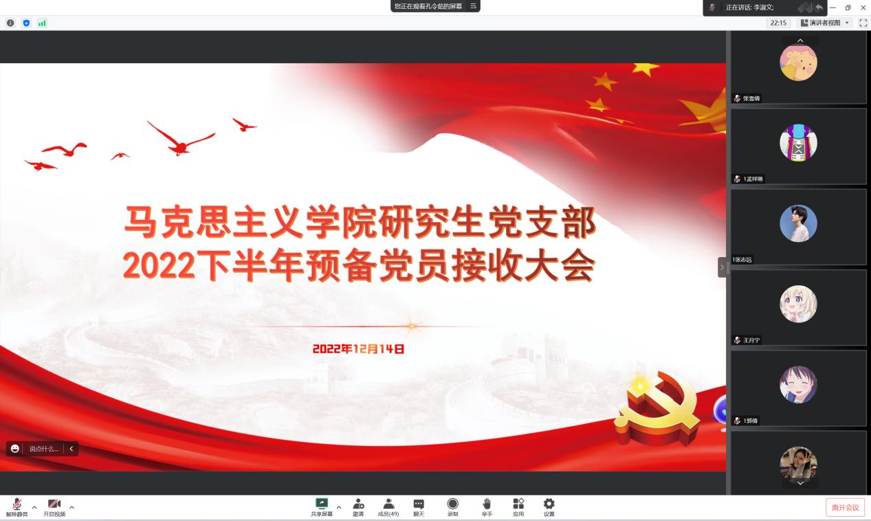 12月14日下午,世俱杯官网研究生党支部于线上召开2022下半年预备党员接收大会,讨论了李淑文、吴东蒙、段依梦、张雪倩、黄非凡、王月宁、毛伟威七位同志转为中共预备党员的问题。本次会议由组织委员孔令茹主持,监票人由宣传委员刘婧一担任,计票人由小组长张晓勤担任。
