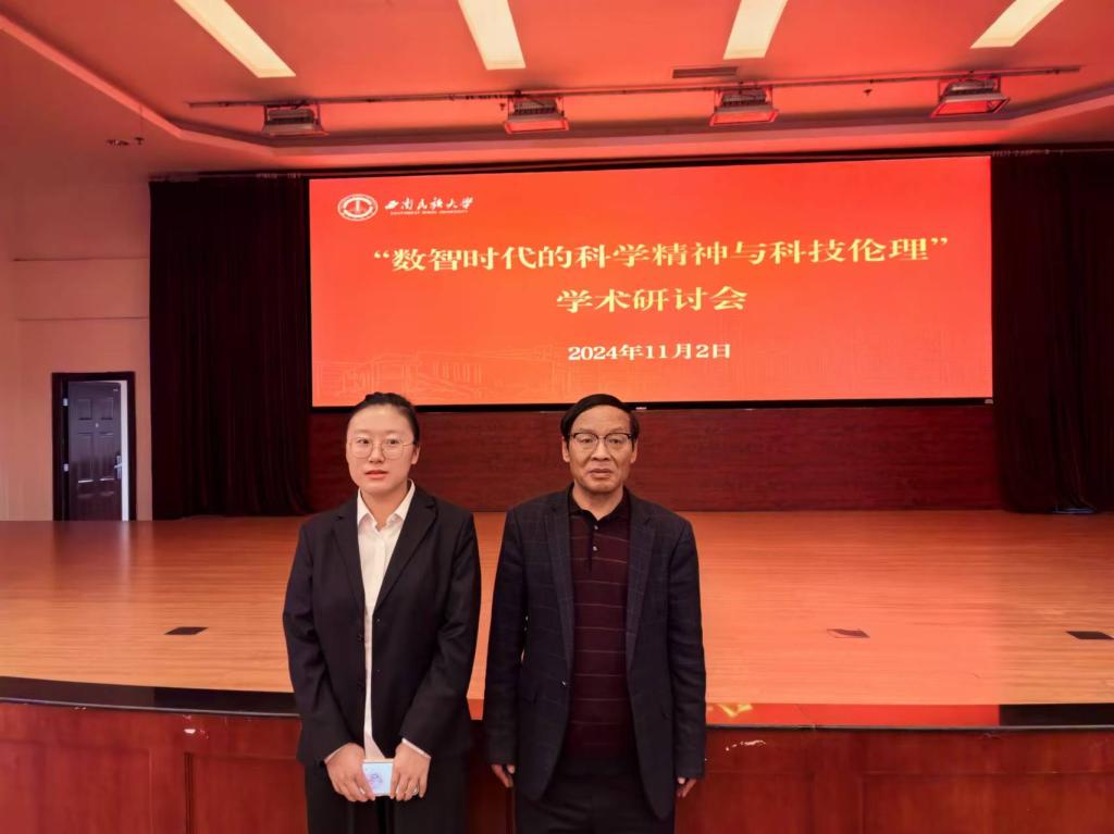 2024年11月1日-3日,“数智时代的科学精神与科技伦理”学术研讨会在西南民族大学举行。受中国自然辩证法研究会科学精神与科技伦理工作委员会以及西南民族大学sjb世俱杯网站的邀请,sjb世俱杯网站教授、河南省科学家精神宣讲团成员张铁山及其研究生赵玮嘉同学共同参加了本次学术会议。张铁山教授以“中国科学家精神谱系及其新时代科学家精神培育”为题,从科学精神、科学家精神、中国科学家精神谱系、西方科学家精神的思想源流、中国科学家精神谱系的生成和内容以及新时代科学家精神培育路径等方面作了一场精彩的具有哲理性和科学性的学术报告,得到了与会专家和学者们的好评和赞誉;研究生赵玮嘉同学以“新时代科学家精神融入初中思政课的路径探究”为题,从新时代科学家精神生成的理论和时代背景、新时代科学家精神的本质内蕴以及新时代科学家精神融入初中思政课的有效路径三个方面对新时代科学家精神的传播方法给予了分析,得到了与会专家和学者们的认可和好评。