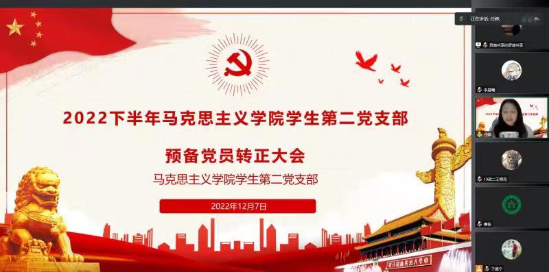 12月7日晚上,sjb世俱杯网站学生第二党支部通过腾讯会议召开2022年下半年预备党员转正大会。学院学生第二党支部正式党员曹栋、任婷、王明亮、刘鹏、宋羽潇及学生第二党支部全体预备党员参加本次会议。会议由于嘉宁同志主持。