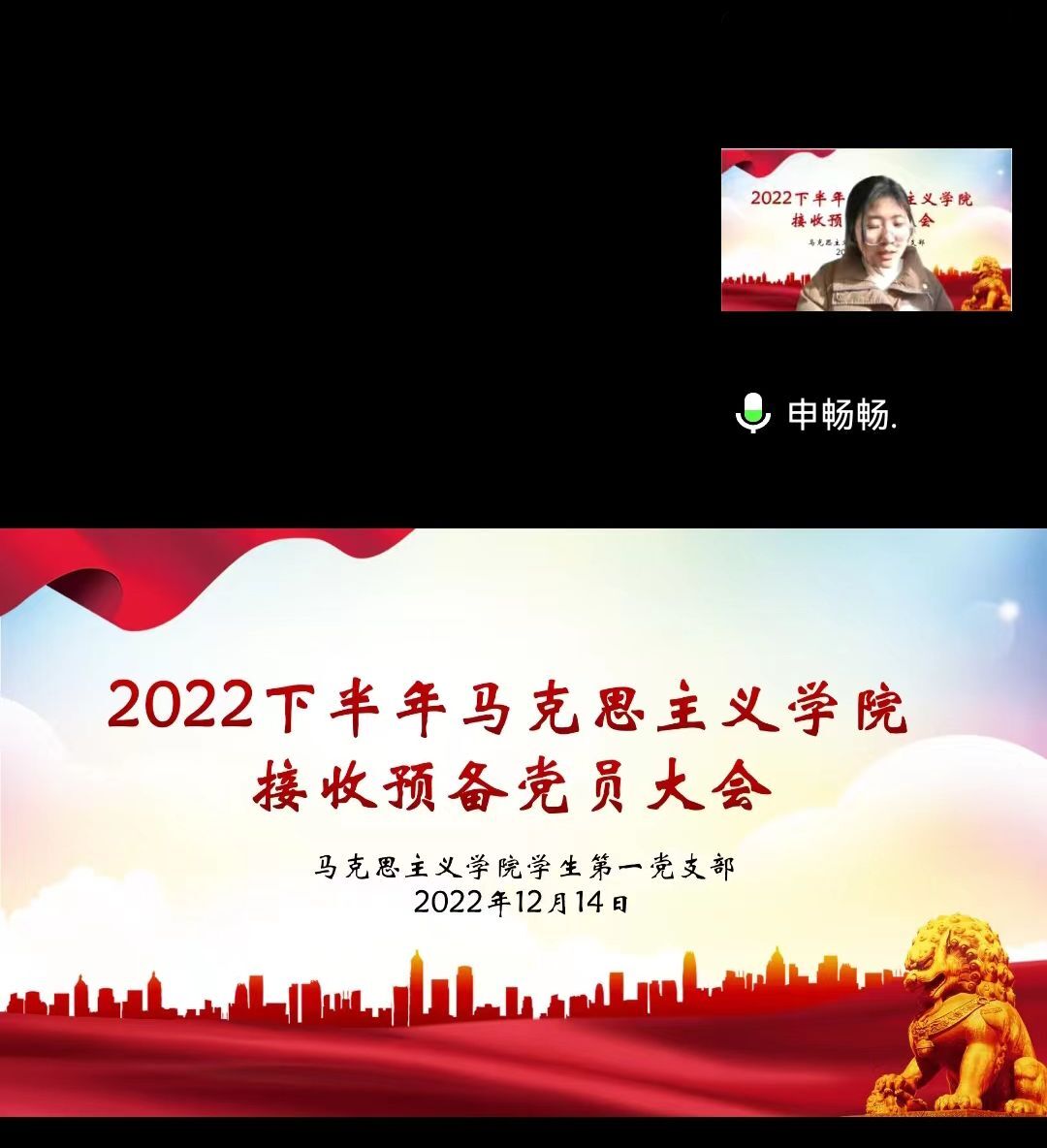 中共信阳师范学院sjb世俱杯网站学生第一党支部委员会于2022年12月14日在腾讯会议召开了2022年下半年接收预备党员支部大会。世俱杯官网学生第一党支部书记高小佳,学生第一党支部全体党员,预备党员和党员发展对象共同参加此次会议。会议由卢茜雨主持。