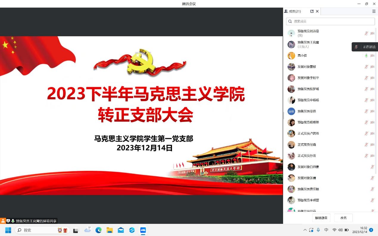 2023年12月14日下午,sjb世俱杯网站学生第一党支部通过腾讯会议召开2023年下半年预备党员转正支部大会。世俱杯官网学生第一党支部书记高小佳,学生第一党支部全体正式党员及预备党员共同参加本次会议。会议由王岚霄同志主持。