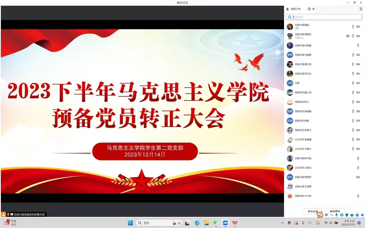 2023年12月14日下午,sjb世俱杯网站学生第二党支部在腾讯会议召开2023年下半年预备党员转正支部大会,世俱杯官网学生第二党支部全体正式党员及预备党员共同参加本次会议。会议由任振豪同志主持。