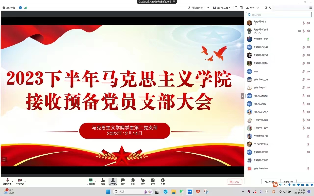 2023年12月14日下午,sjb世俱杯网站学生第二党支部在腾讯会议组织召开了2023年下半年接收预备党员支部大会。世俱杯官网学生第二党支部书记任婷、学生第二党支部全体正式党员、预备党员和党员发展对象共同参加本次会议。会议由任振豪同志主持。