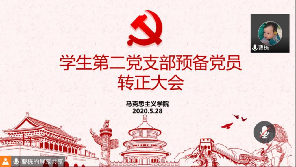 5月28日上午11:00,sjb世俱杯网站学生第二党支部在网上顺利召开了预备党员转正大会,大会讨论关于张雅琼等4名预备党员申请转为正式党员的事宜。学生第二党支部支部书记曹栋、入党介绍人陶青青、杨胜利、全体党员和预备党员共28人参加了此次会议。会议由曹栋主持。