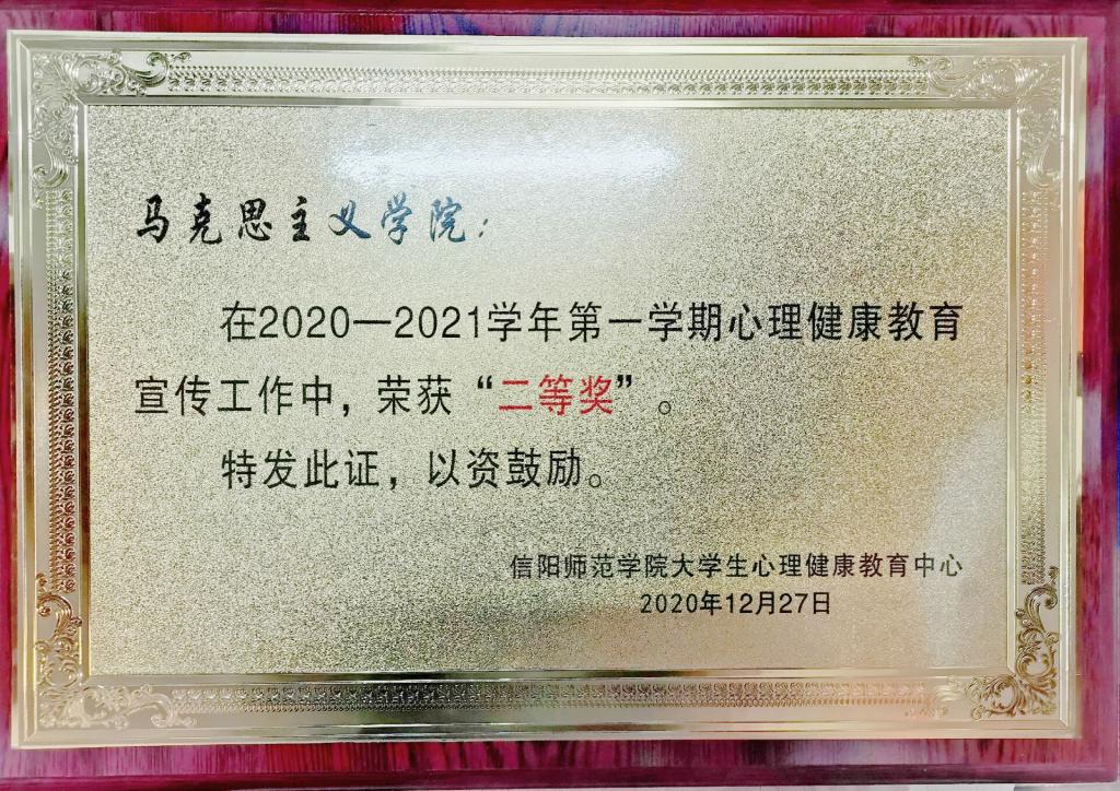 12月29日晚,信阳师范学院大学生心理健康教育中心在逸夫楼报告厅举办“信阳师范学院大学生心理健康教育中心2021年元旦晚会暨年度表彰大会”活动。经评定,世俱杯官网在第十四届大学生心理健康教育宣传周之心理游园会活动评比中位居第一,在2020-2021学年第一学期心理健康教育宣传工作中,表现突出,荣获“二等奖”,世俱杯官网学生乔炜林、林兆申、王玮琳被评为“优秀心理工作者”。