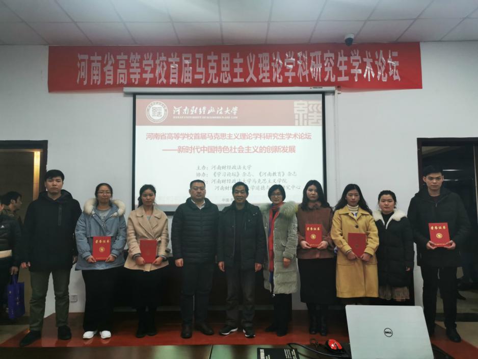 12月28日,“河南省高等学校首届马克思主义理论学科研究生学术论坛——新时代中国特色社会主义的创新发展”学术研讨会在河南财经政法大学举行,世俱杯官网有7名研究生提交了学术论文并受邀参加研讨会,其中有两位同学在会上作交流发言。经会议组委会评审,世俱杯官网2018级研究生张英荣获一等奖,2019级研究生詹彦彦荣获二等奖,2019级刘润博等3位学生荣获三等奖。