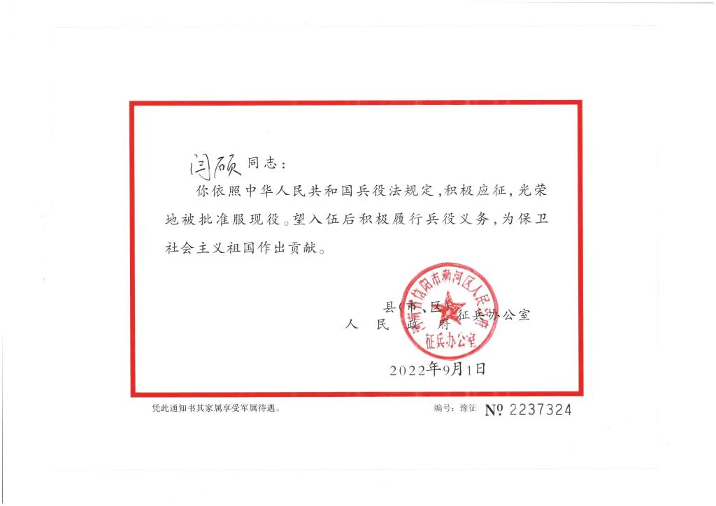 风华正茂志气高,投身军旅献青春。进入新时代,大批青年学子继承优良传统,赓续红色血脉,将爱国之心转化为实际行动,将青春与热血挥洒在实现强军梦的伟大实践之中。sjb世俱杯网站2018级思想政治教育二班应届毕业生白杰和2020级思想政治教育二班闫硕积极响应国家号召,应征入伍,立志为国防事业贡献自己的青春力量。