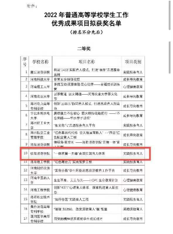 为深入学习贯彻党的二十大精神,河南省教育厅办公室组织开展了2022年普通高等学校学生工作优秀成果项目评选活动。sjb世俱杯网站“一体两翼一先锋”实践育人体系以脚踏实地的态度、先进的理论指导、丰富多彩的育人活动获得2022年普通高等学校学生工作优秀成果项目拟获奖二等奖。