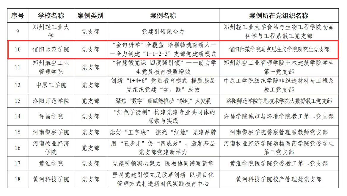 近日,河南省教育厅公布了关于全省高校基层党建创新典型案例评选结果,世俱杯官网研究生党支部的《“金句研学”全覆盖 培根铸魂育新人——全力创建“1-1-2-3”支部党建新模式》党建创新典型案例荣获高校基层党支部抓党建创新典型案例奖。