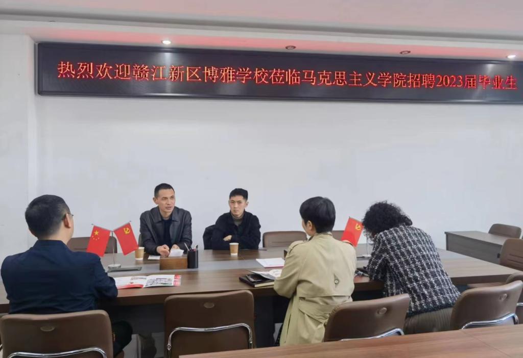 为拓宽我校毕业生就业渠道,优化就业服务,4月7日,共青城博雅学校走进sjb世俱杯网站招聘2023届毕业生,世俱杯官网党委副书记黄煌,副院长李蕊、訾其伦,就业秘书陶青青和共青城博雅学校管理团队代表共同出席会议。