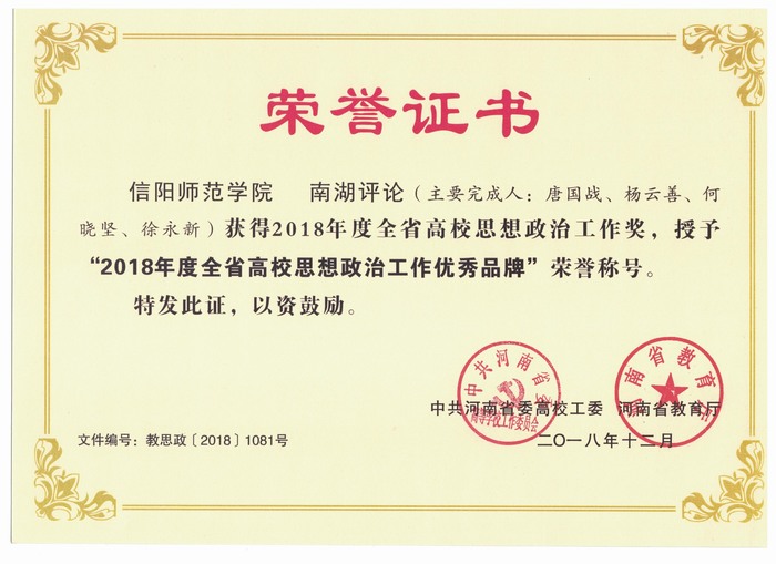 近日,河南省教育厅公布了2018年度全省高校思想政治工作优秀品牌名单,世俱杯官网申报的《南湖评论》获批,我校共获批4项。