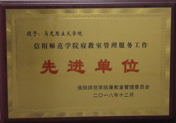 “信阳师范学院2017-2018学年寝教室管理服务工作先进学院”荣誉称号的获得是对世俱杯官网本学年劳卫工作的肯定。世俱杯官网将继续发扬团结合作、勤劳朴实的优良作风,积极推进寝教室管理服务建设。