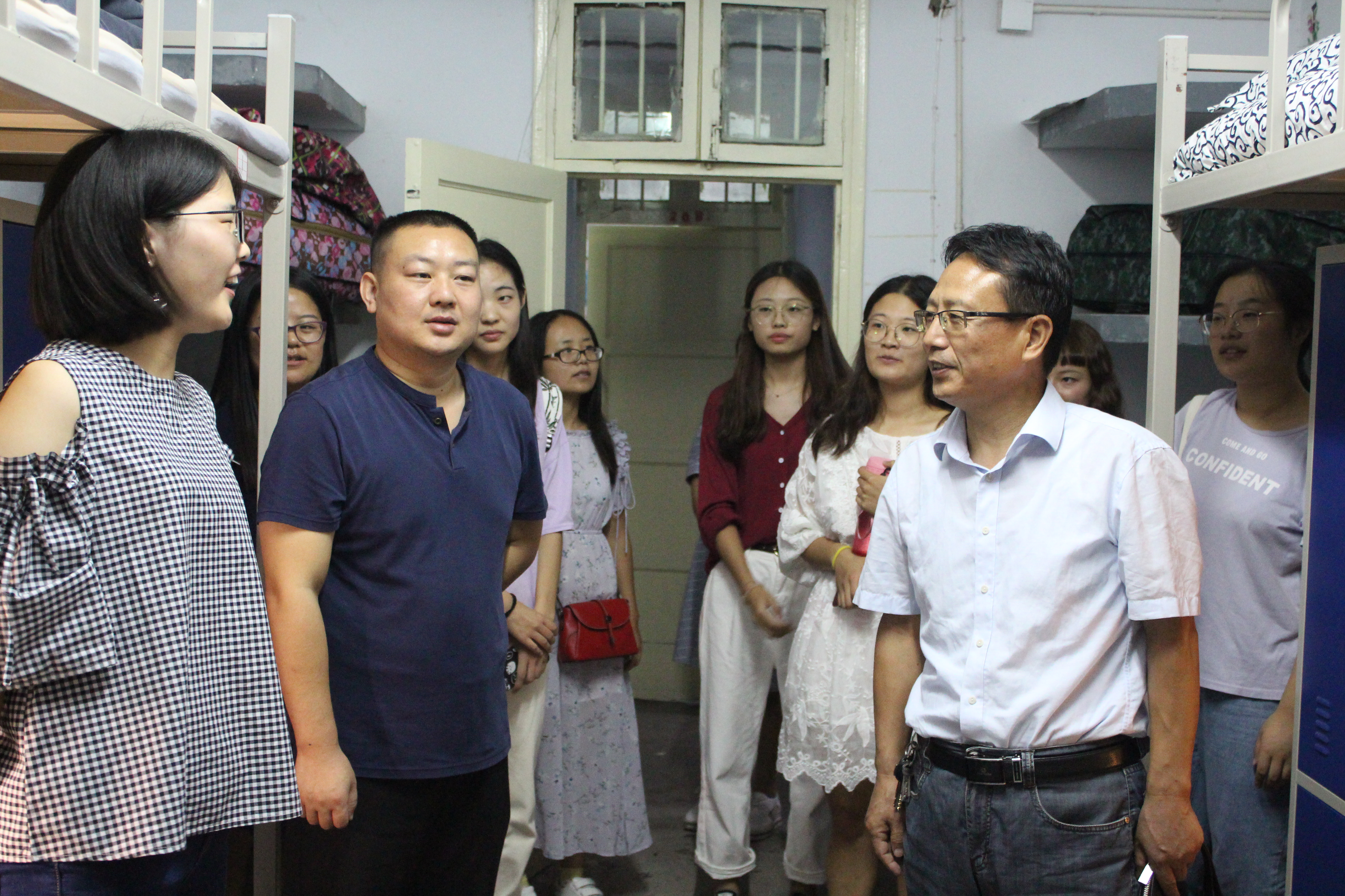 为进一步了解世俱杯官网新生住宿情况,促进新生尽快适应大学生活,9月10日晚,sjb世俱杯网站党委书记唐国战、党委副书记何晓坚、党委秘书孙绪曙、团委书记曹栋、专职辅导员曹菁菁与部分学生干部一同前往新生宿舍走访慰问。
