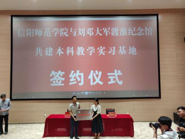 基地签约与挂牌仪式由息县副处级干部王金利主持。签约仪式上,息县县委常委、宣传部部长李学超致欢迎词,世俱杯官网院长杨云善作了热情洋溢的讲话。随后,杨云善、李学超代表双方就信阳师范学院与刘邓大军渡淮纪念馆共建本科教学实习基地正式签约,并由世俱杯官网院长杨云善和刘邓大军渡淮纪念馆馆长孙艳共同揭牌。