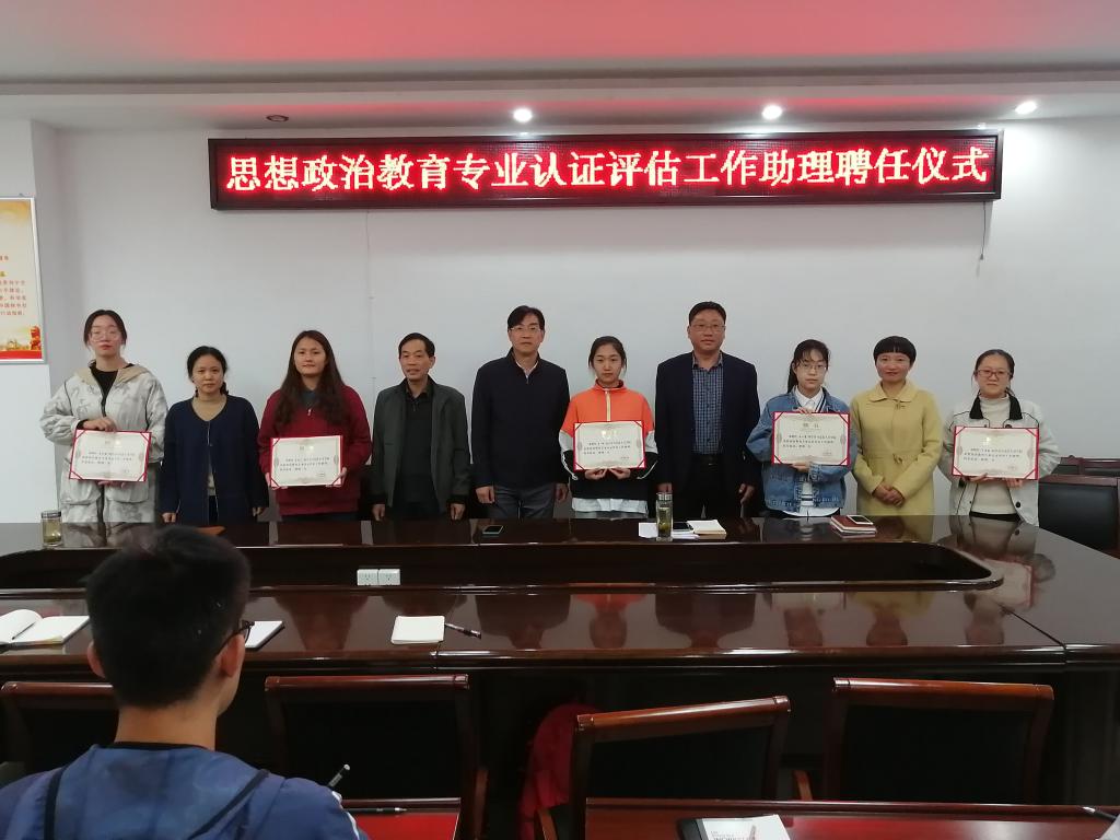 10月20日下午,sjb世俱杯网站在社科楼323会议室举行思想政治教育专业认证评估工作助理聘任仪式。sjb世俱杯网站副院长周智、黄世明、程晋富,思想政治教育系主任李蕊,教学督导专家谷茵以及学生助理共同参加了聘任仪式。仪式由程晋富主持。