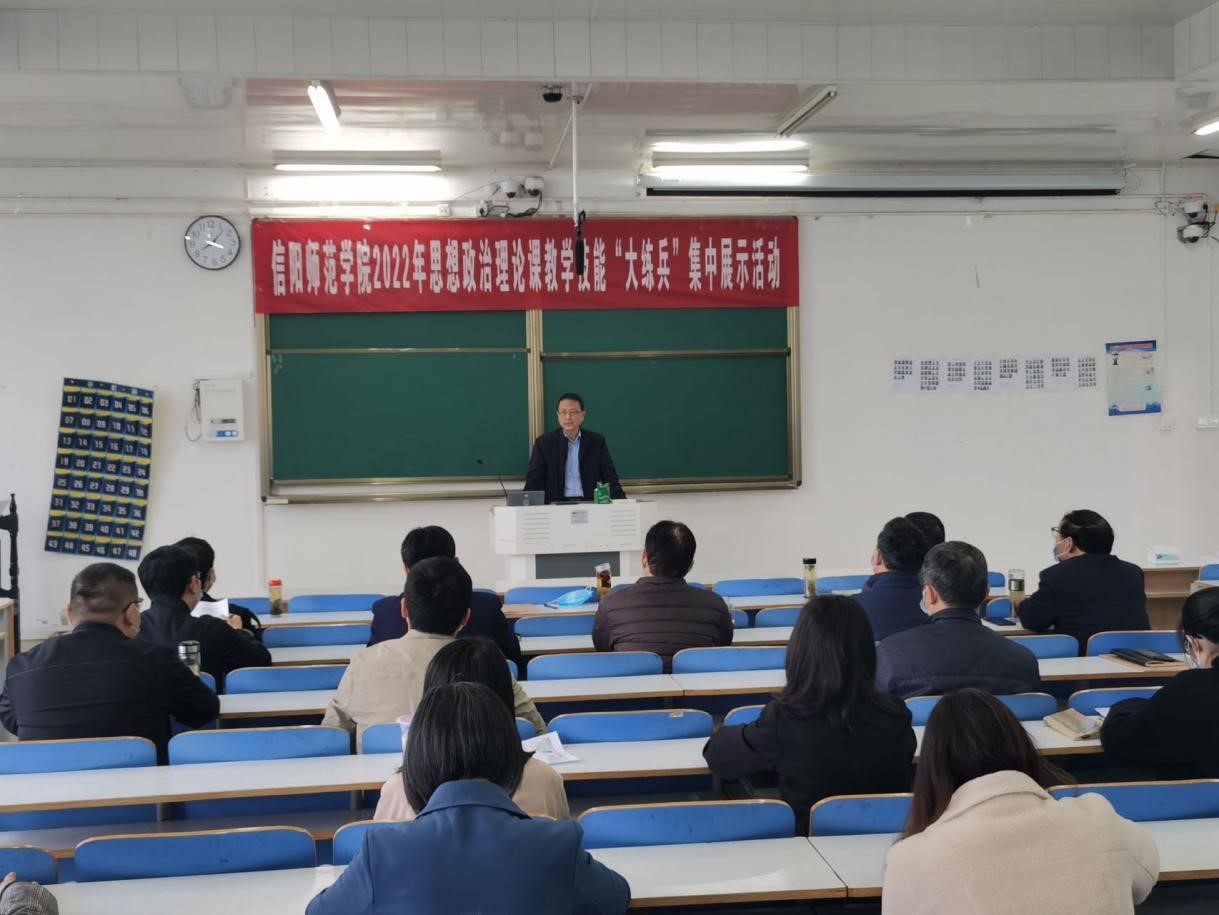 为进一步贯彻落实省教育厅和学校《关于开展思想政治理论课教学技能“大练兵、大比武、大展示、大提升”活动的通知》精神,切实提高我校思想政治理论课教学技能和水平,4月16日上午,sjb世俱杯网站在社科楼开展了“大练兵”阶段教学技能集中展示活动,全体思政课专兼职教师参加教学技能展示,学院党政领导班子成员和相关专家教授参加了评议活动,活动由副院长訾其伦主持。