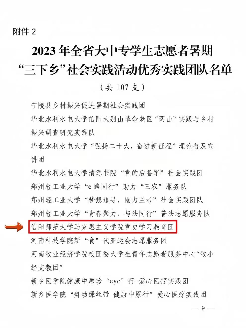 近日,中共河南省委宣传部、共青团河南省委、河南省教育厅、河南省学生联合会下发《关于2023年全省大中专学生志愿者暑期文化科技卫生“三下乡”社会实践活动的通报》,世俱杯官网“青春共学‘习’,奋进新时代”党史学习教育团荣获2023年全省大中专学生志愿者暑期“三下乡”社会实践活动优秀实践团队,是我校唯一入选的优秀实践团队。