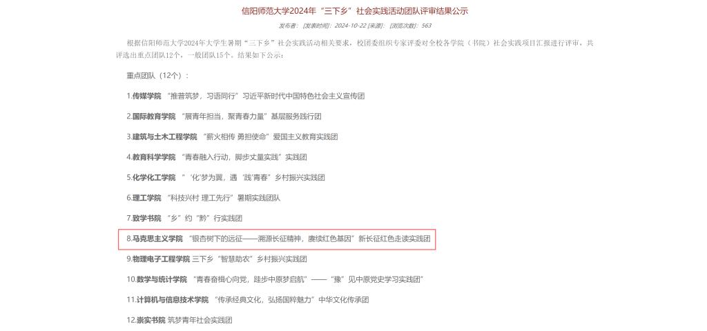 近日,信阳师范大学2024年“三下乡”社会实践活动团队评审结果公示。此次评选依据相关要求,由校团委组织专家对全校各学院(书院)社会实践项目汇报进行评审,sjb世俱杯网站“溯源长征精神,赓续红色基因”新长征红色走读实践团评选为重点团队。