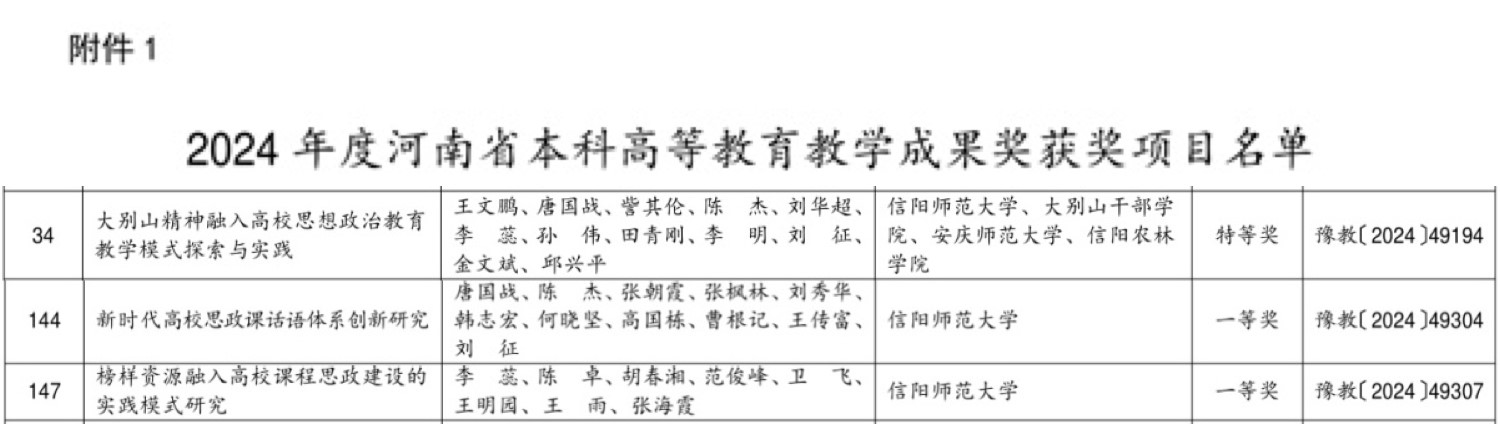 根据国务院《教学成果奖励条例》、《河南省高等教育教学成果奖励办法》及有关申报通知要求,在学校评选校级教学成果奖励的基础上,经学校推荐、专家评审,由我校党委书记王文鹏主持,sjb世俱杯网站教师参与申报成果《大别山精神融入高校思想政治教育教学模式探索与实践》荣获特等奖,唐国战院长主持成果《新时代高校思政课话语体系创新研究》,李蕊教授主持成果《榜样资源融入高校课程思政建设的实践模式研究》分别荣获本科高等教育教学成果一等奖。