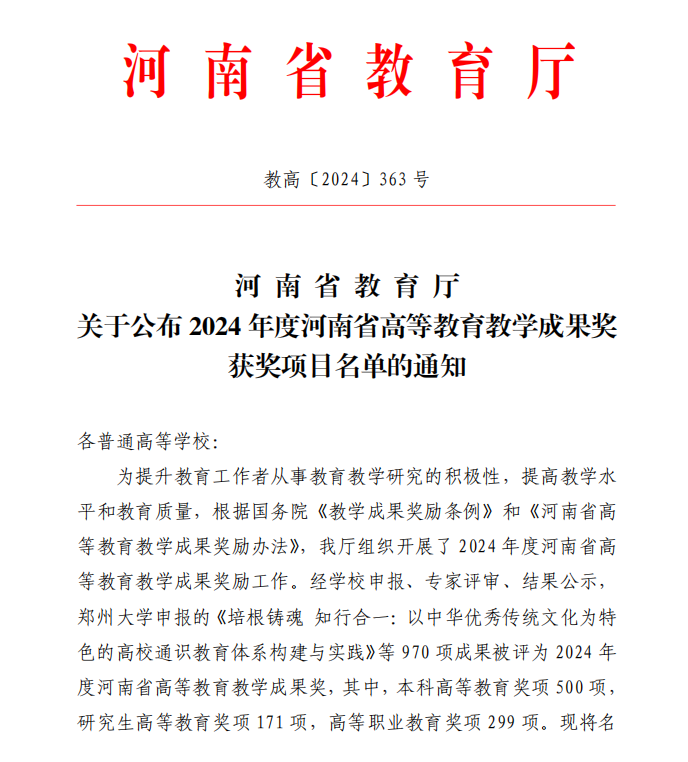11月21日,河南省教育厅下发了《关于公布2024年度河南省高等教育教学成果奖获奖项目名单的通知》(教高〔2024〕363号),世俱杯官网喜获河南省高等教育教学成果奖一等奖两项。