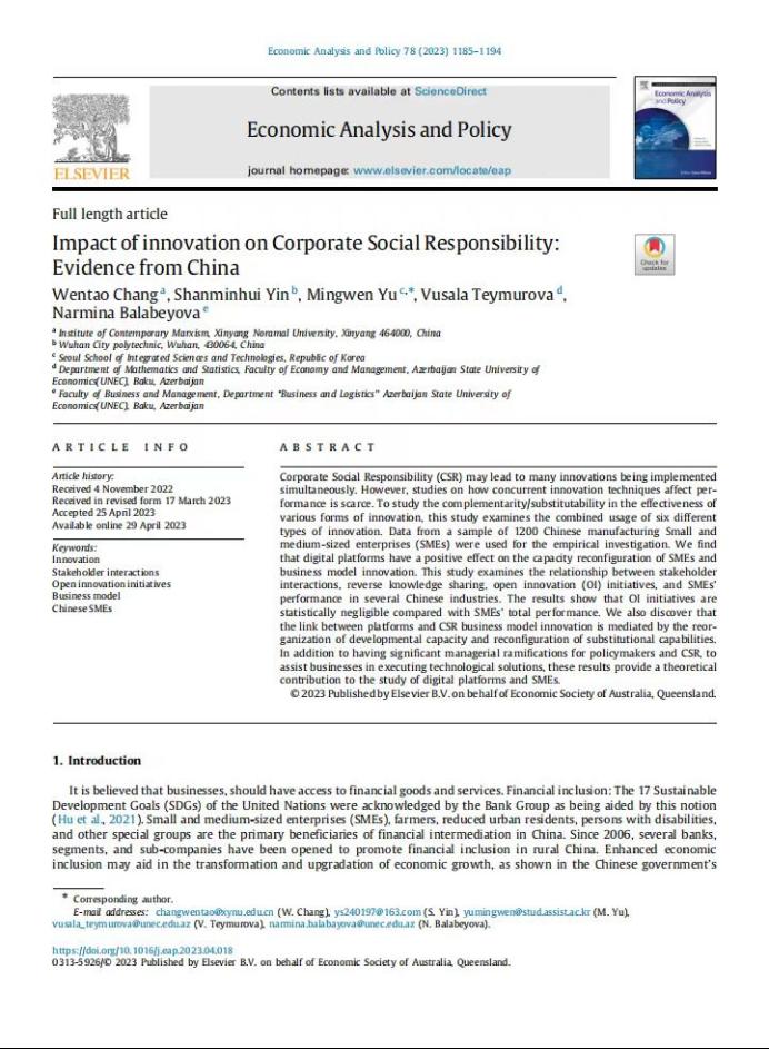 世俱杯官网常文涛博士在SSCI(JCR 一区)刊物《Economic Analysis and Policy》上发表题为“Impact of innovation on Corporate Social Responsibility: Evidence from China”的学术论文。