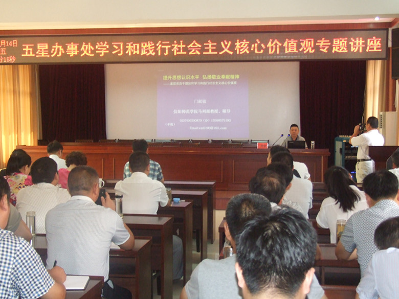 8月15日下午,由信阳市浉河区五星办事处主办的“社会主义核心价值观”专题讲座在该办事处二楼会议室举行, 中共河南省委宣讲团成员,河南省社科志愿者进基层专家宣讲团成员,我部《基础》课教研室主任门献敏教授应邀担任主讲嘉宾。该办事处班子成员和全体干部共100余人聆听了讲座。