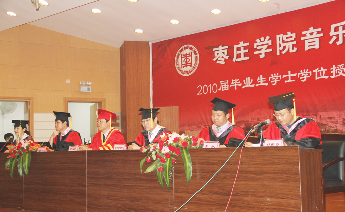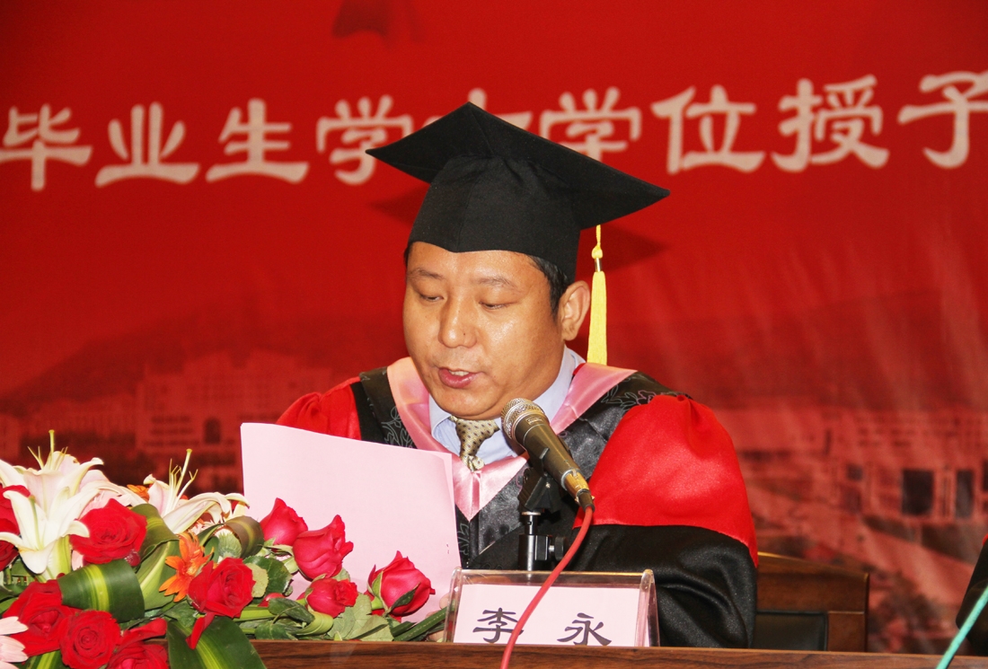 在庄严的国歌声中,音乐系2010届毕业生学士学位授予仪式正式开始。仪式上,系党总支副书记、副主任李永发表了热情洋溢的讲话,向被授予学士学位的同学们表示祝贺,并对毕业生提出了三点希望,一是继续努力奋斗,在新的岗位上建功立业。二是树立终身学习的理念,在新的人生征程中实现全新的跨越。三是永远心怀母校,与母校携手并肩共创辉煌。最后题诗《清平乐 欢送》一首献给全体毕业生,祝福同学们前程似锦、一路顺风!