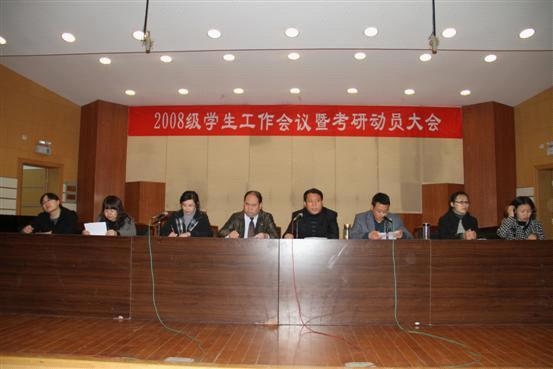 为更好地帮助学生了解考研的形势政策和备考安排,3月30日下午,beat365英国官网网站在二楼音乐厅举行2008级学生工作会议暨考研动员大会,学院党总支书记邓兴珍,院长李永,副院长吴蕾、郑发奋及教师参加了会议。副院长吴蕾主持会议。