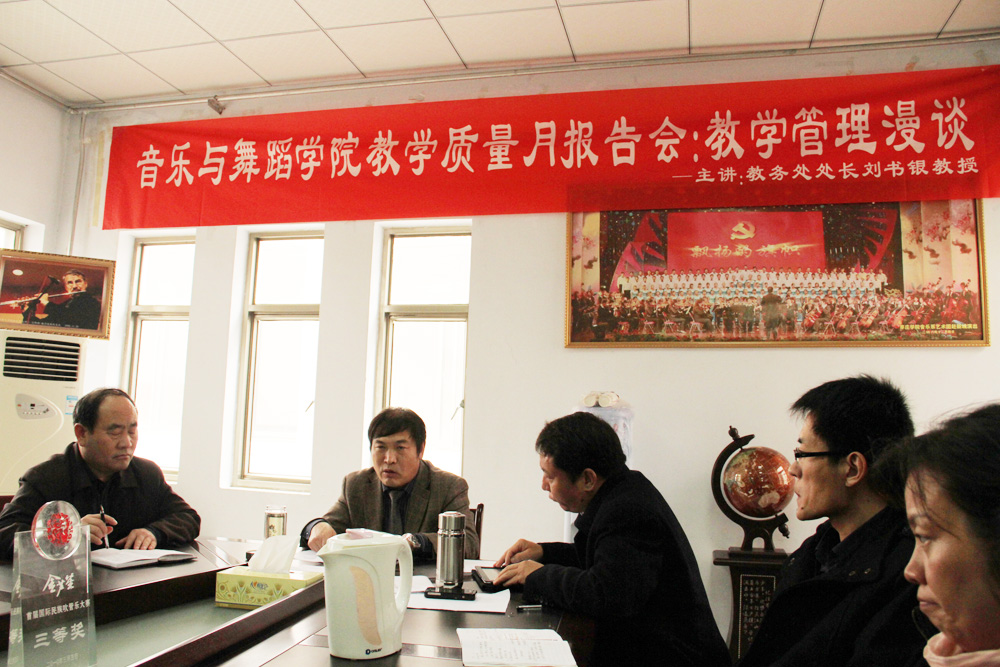 为配合“抓好四风建设,推进音院发展”教学规范化建设月活动的开展,11月16日下午1点30分,beat365英国官网网站邀请学校教务处处长刘书银教授在音乐楼会议室作了“教学管理漫谈”专题讲座。党总支书记邓兴珍、院长李永及全院教职员工参加了讲座,讲座由李永院长主持。
