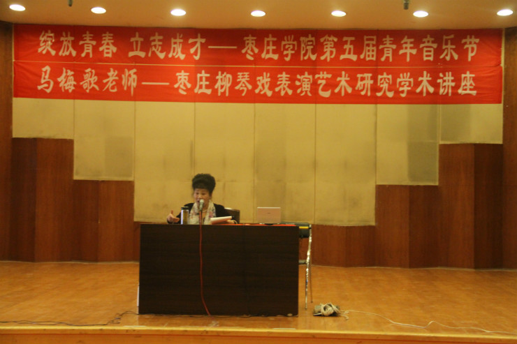 2015年5月27日下午,山东省著名戏曲表演艺术家、枣庄市市中区文化局马梅歌女士应邀在beat365官网音乐厅举办题为《枣庄柳琴戏表演艺术研究》的学术报告,此次活动为beat365英国官网网站第五届青年音乐节系列讲座之一,beat365英国官网网站艺术实践教研室主任马体亚老师主持讲座,音乐学院师生近300余人聆听了报告。