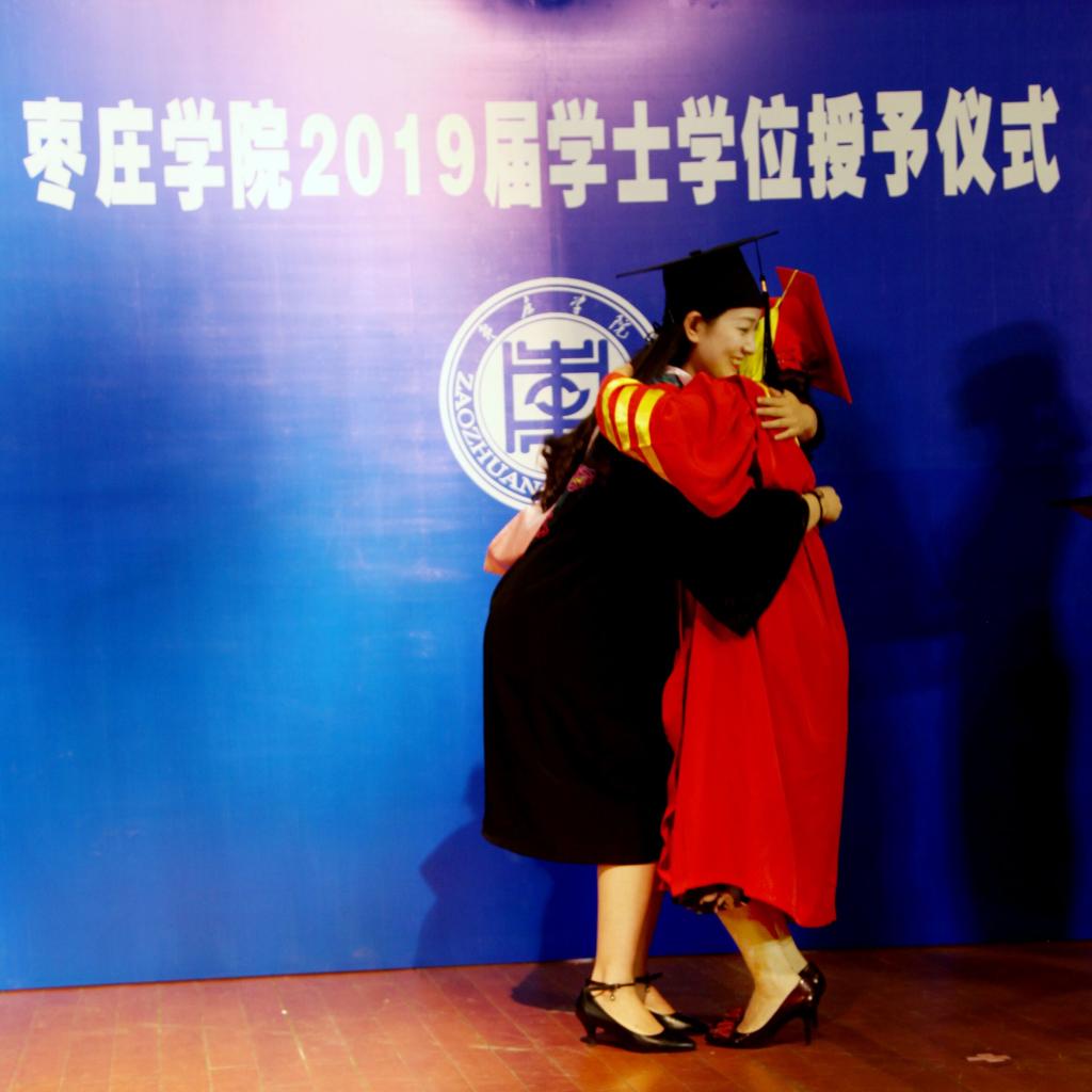 伴随着欢快的乐曲,毕业生身穿学士服,依次走向主席台,深情地鞠躬。李丽清教授亲切地与2019级每一位获得学士学位的同学握手,为他们扶苏、拨穗、正冠,颁发毕业证书并合影留念。