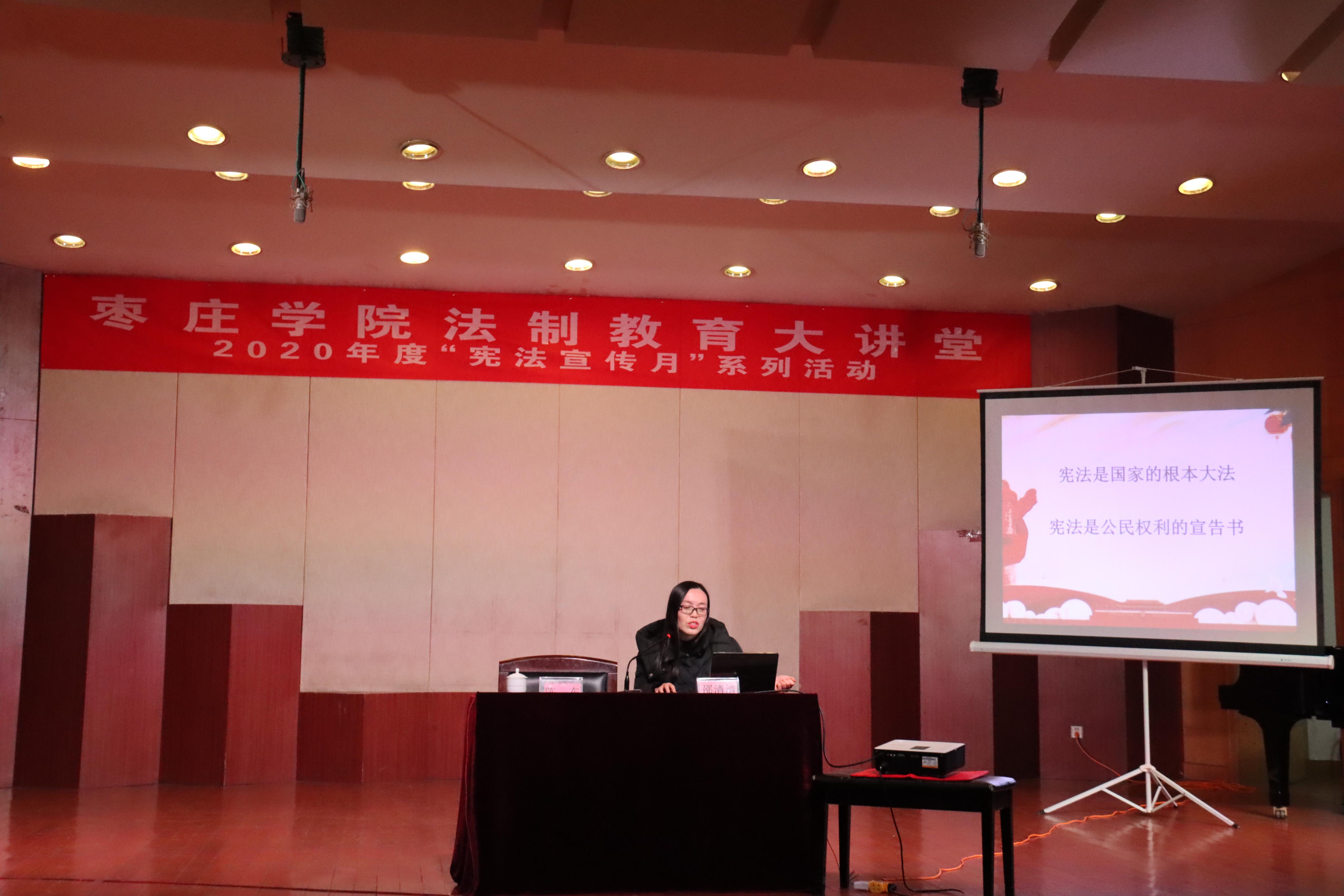 为弘扬法治精神,提高学生法律素养和法律意识,2020年12月9日晚,beat365英国官网网站于音乐厅举行“beat365英国官网网站法制教育大讲堂”讲座,邀请党委宣传部邵清清为2020级全体同学进行法律知识宣讲,本次讲座由院团学负责人陈东主持。