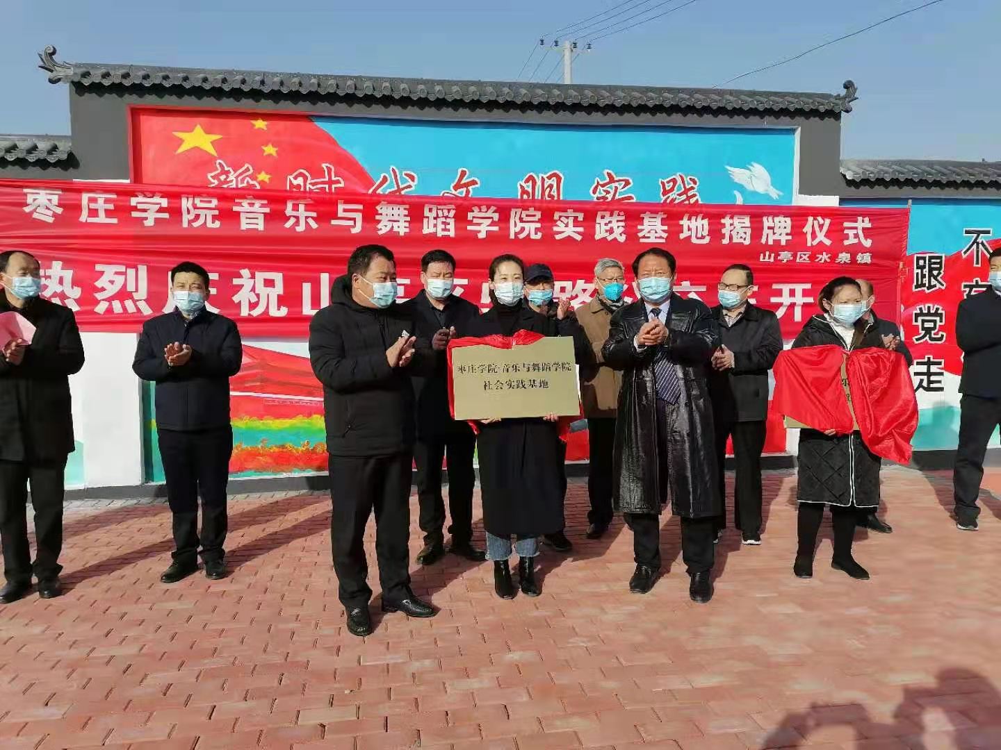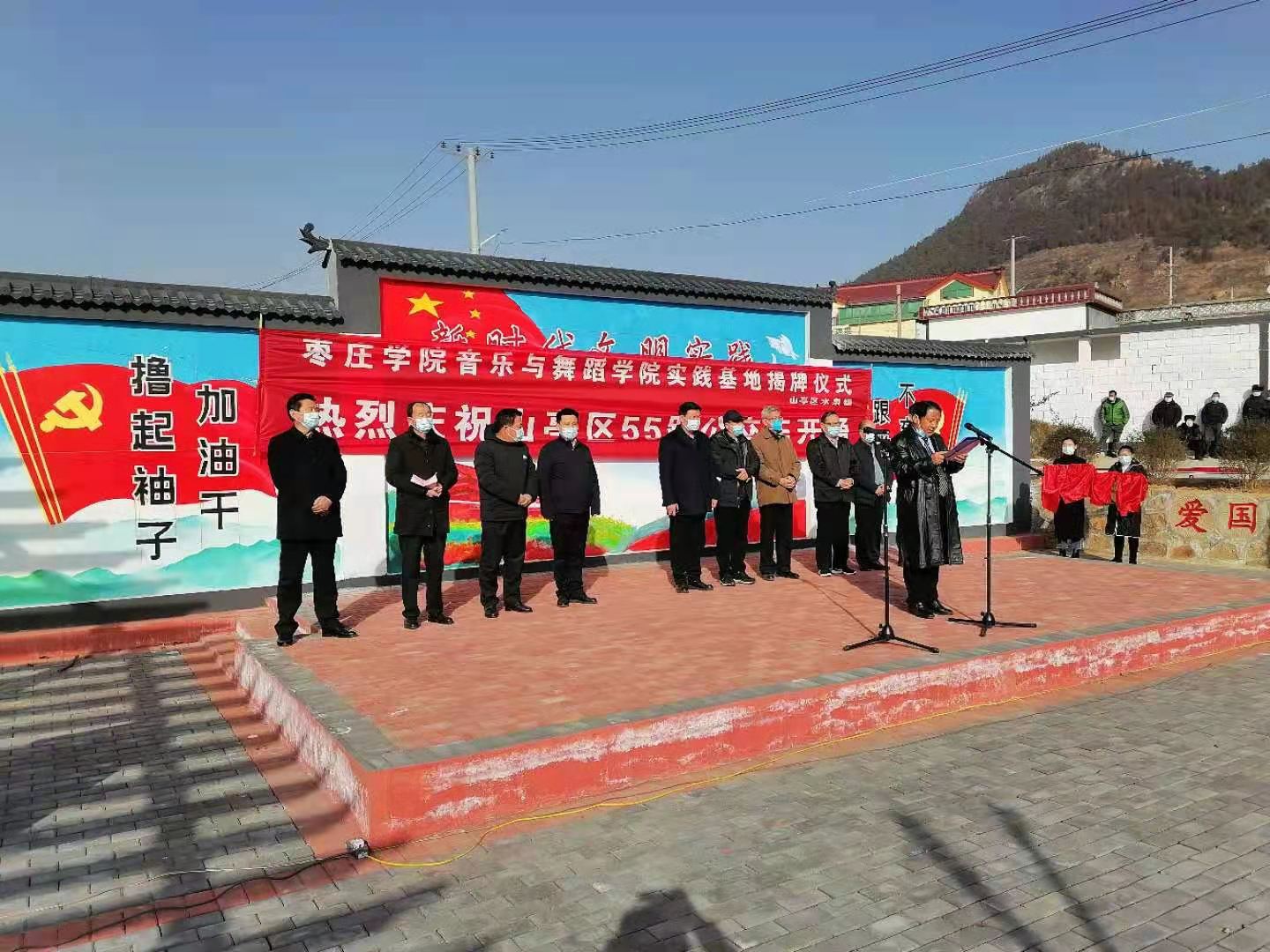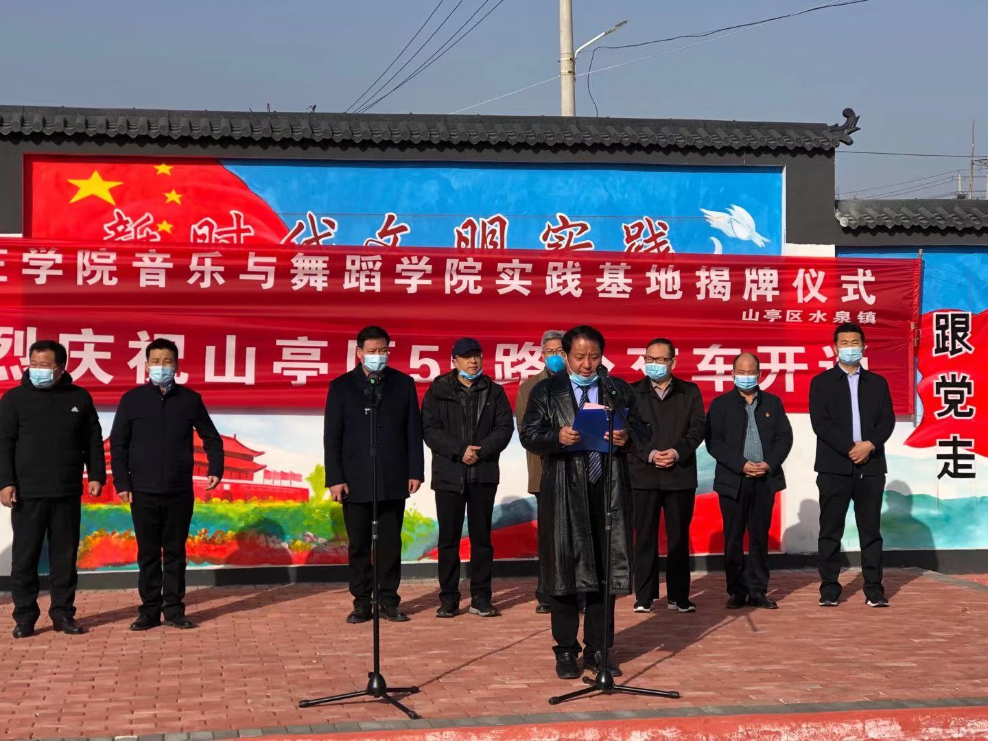 1月12日上午,beat365英国官网网站与山亭区水泉镇共建大学生实践基地(艺术实践、社会实践)揭牌仪式在水泉镇白蒋峪村举行,beat365英国官网网站院长李永、枣庄市文化和旅游局副局长李志宏、水泉镇乡村振兴服务队队长贾广平、枣庄市文化馆馆长徐隆、枣庄市文化馆党支部书记孙辉、山亭区文化和旅游局局长王明翰、水泉镇党委书记郗涛勇出席了本次活动,李永为本次揭牌仪式发表了致辞。
