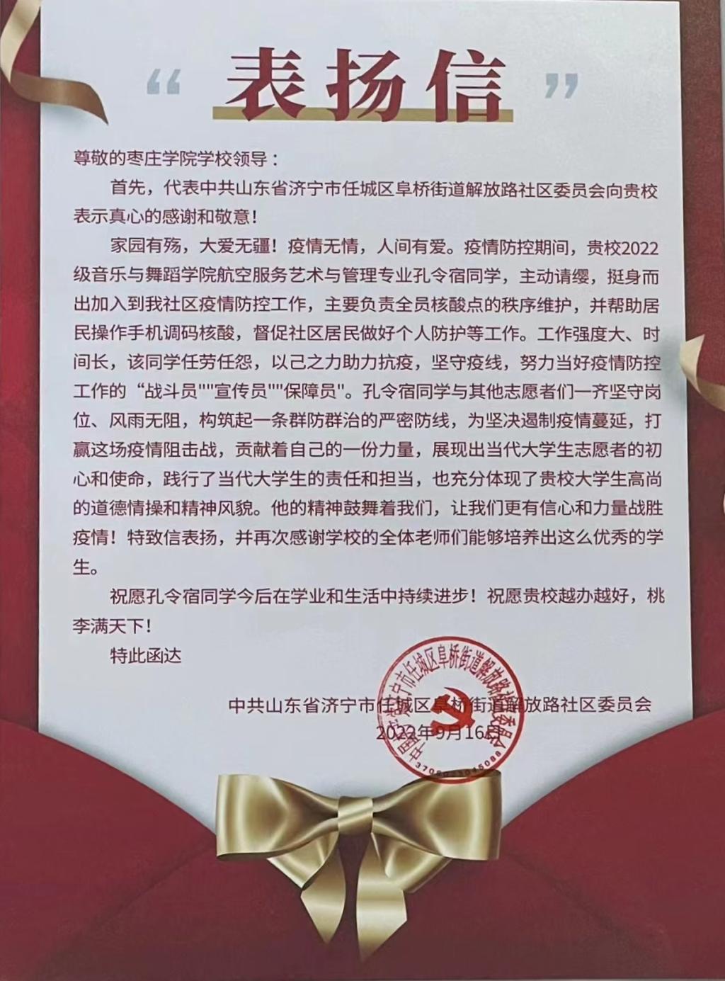 在志愿服务结束后,济宁市任城区阜桥街道解放路社区委员会对beat365官网孔令宿同学勇于担当大学生志愿者的初心和使命,践行当代大学生的责任和担当提出表扬,同时就孔令宿同学的表现向beat365英国官网网站表示感谢。
