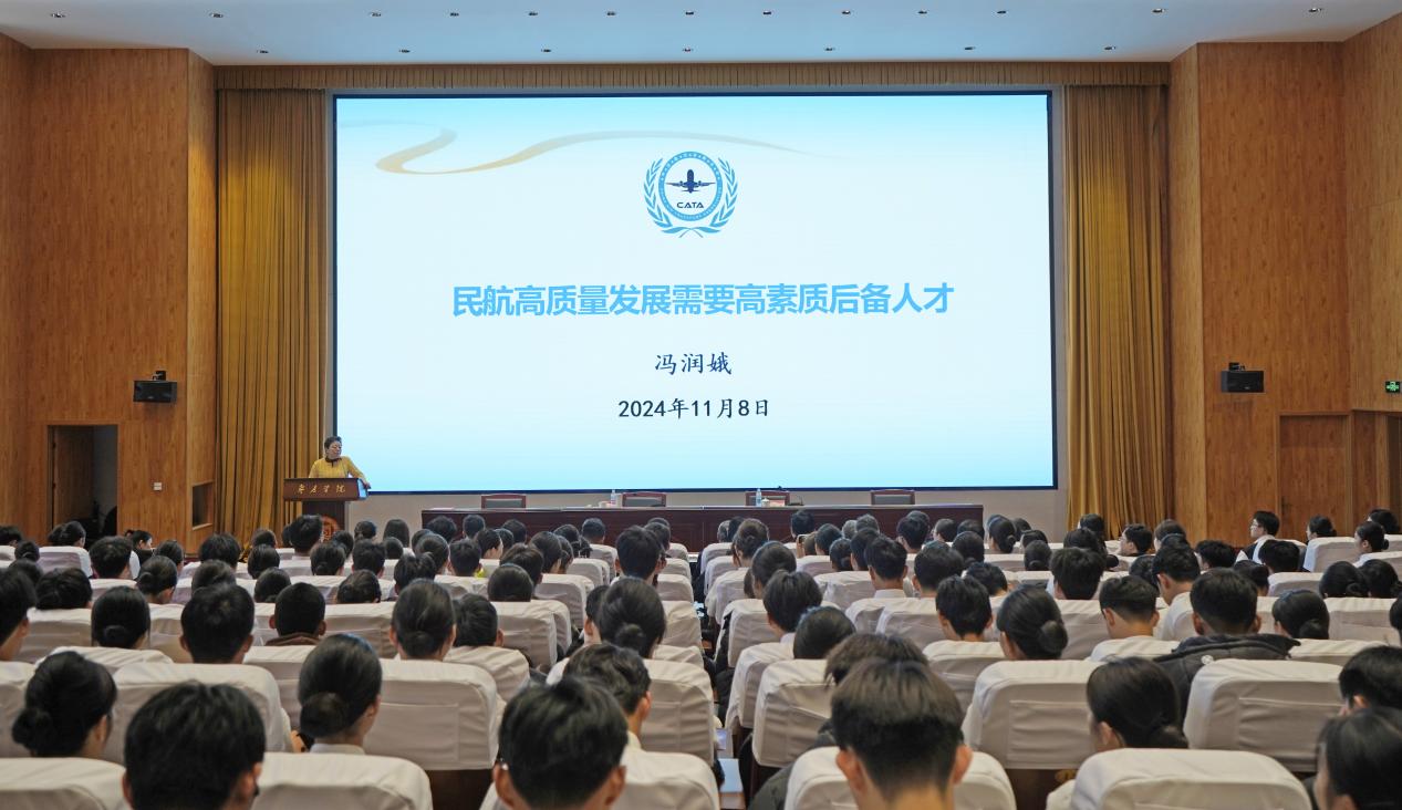 冯润娥以《民航高质量发展需要高素质后备人才》为题,从三个重点作报告,回顾了中国民航的发展历程,从最初的“民航十八姐妹”到现在的十万客舱人,深情讲述了民航人“立足小客舱,服务大世界”的责任与担当,指出民航是推动中国式现代化的重要支撑;在培养学生过程中,切实做到“三贴近”,即贴近时代、贴近行业、贴近学生,培养有大目标、有大视野、有大本领、有大文化的“四有”学生,强调民航高质量发展需要爱党爱国爱民航、具有教育家精神的师资队伍;三是民航高质量发展离不开高素质的人才队伍,新时代的乘务员不仅要有过硬的专业技能,更要有根植于心底的修养、无需提醒的自觉、约束前提下的自由和为他人着想的善良。冯书记结合自己多年的工作经历,分享了自己在航空领域的丰富经验和深刻见解,生动诠释了民航人应具备的职业素养和道德品质。报告内容详实、观点鲜明、情感真挚,赢得了现场师生的阵阵掌声。