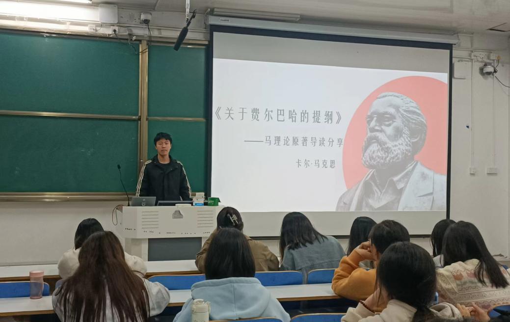 本次学员们分享的书籍是《关于费尔巴哈的提纲》(以下简称《提纲》)。该手稿是马克思于1845年春在布鲁塞尔写的笔记,这篇笔记表明马克思不仅同唯心主义,而且同旧唯物主义彻底划清了界限,为创立新世界观奠定了基础。是“包含着新世界观的天才萌芽的第一个文献”。在分享会上,余浩洋同学首先进行了他的读书感悟分享。他将《提纲》中的第四条和第十一条做了对比,指出了《提纲》中的第四条和第十一条体现了新旧哲学的区别。他强调,第四条中,费尔巴哈仅仅把宗教作为世俗基础,而第十一条才真正揭示了哲学的功能和使命,即通过社会实践来改变世界。其次,李雯娜同学进行了她的读书感悟分享。她对整个《提纲》进行了分类。她指出,《提纲》中的第一条和第二条为一组,批判了旧唯物主义主义和唯心主义的局限;第三条至第十条为一组,确立了新唯物史观的基础,奠定唯物史观理论大厦的基石;第十一条单独为一组,揭示了新唯物主义的历史使命。