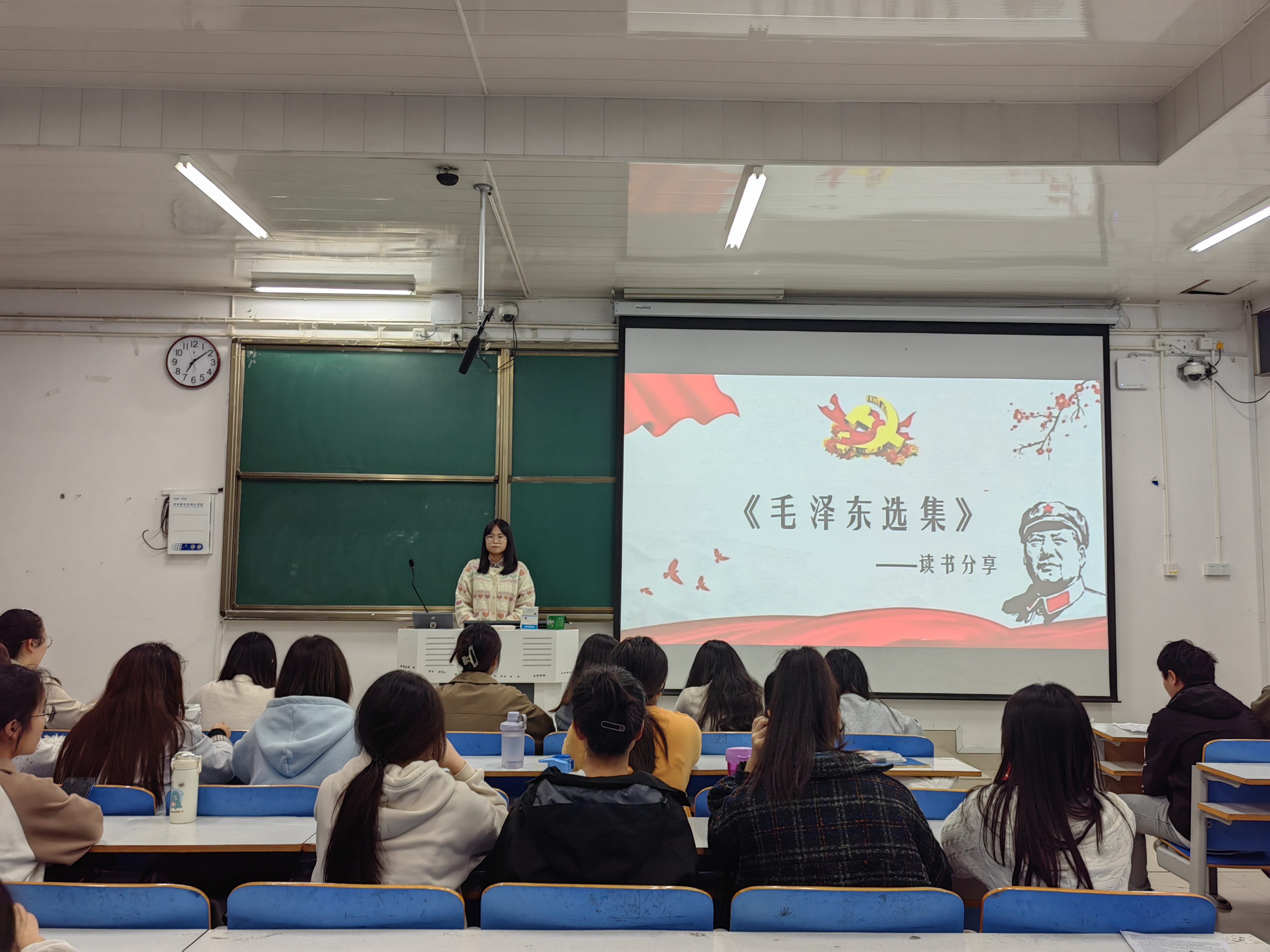 本次读书分享会以《毛泽东选集》为主题,在分享会上,王思源同学和李佳音同学分享了自己的读书感悟。首先,王思源同学分享了令她记忆深刻的一篇文章,《湖南农民运动考察报告》一篇中,毛泽东同志在陈述农民运动概况并批评了反对农民运动的谬论后,仔细记录农民所有的行动总结出了十四件大事,娓娓道来,铿锵有力。她表示书中毛泽东同志将所思所想与理论知识相结合,使得理论部分易于理解并令人记忆深刻。随后,李佳音同学在感悟中说到,《井冈山的斗争》一文中从军事问题、土地问题、政权问题、党的组织问题、革命性质问题、割据地区问题六方面清晰明了地描述了当时割据地区的形势,让我们感受到红军面临的各种困难和工农武装割据应具备的条件。她表示在重温这段历史的过程中深深感受到了毛泽东思想的号召力、革命精神的凝聚力和伟大人格的感染力。