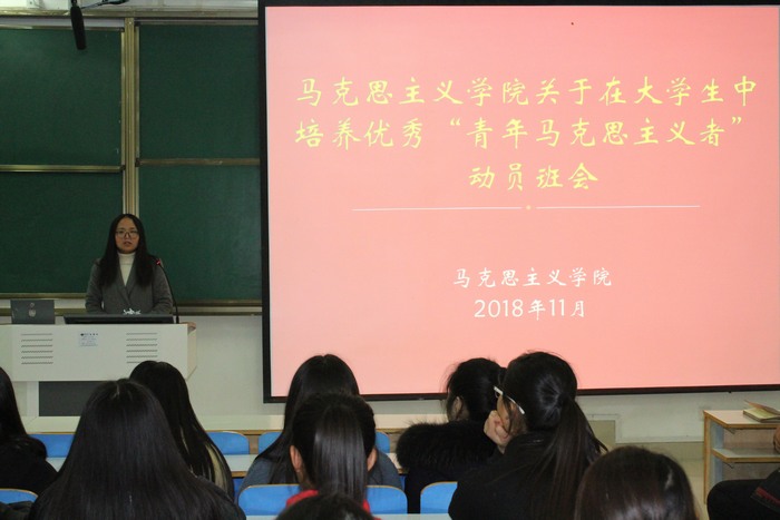 为培养优秀青年马克思主义者,坚定大学生马克思主义信仰,11月25日晚,sjb世俱杯网站在社科楼514教室顺利开展关于在大学生中培养优秀“青年马克思主义者”动员班会。团委老师曹菁菁、河南省“青年马克思主义培养工程”学员史弘扬和世俱杯官网2017、2018级全体同学共同参加本次班会。此次班会由曹菁菁主持。