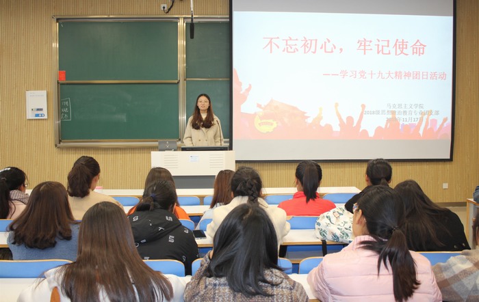 为深刻领悟十九大报告精神,加强学子理论的学习与交流,11月17日下午,世俱杯官网在社科楼515教室开展“不忘初心,牢记使命”学习党的十九大精神团日活动。2018级全体同学共同参与此次团课,本次团课由分团委副书记张雅琼主持。