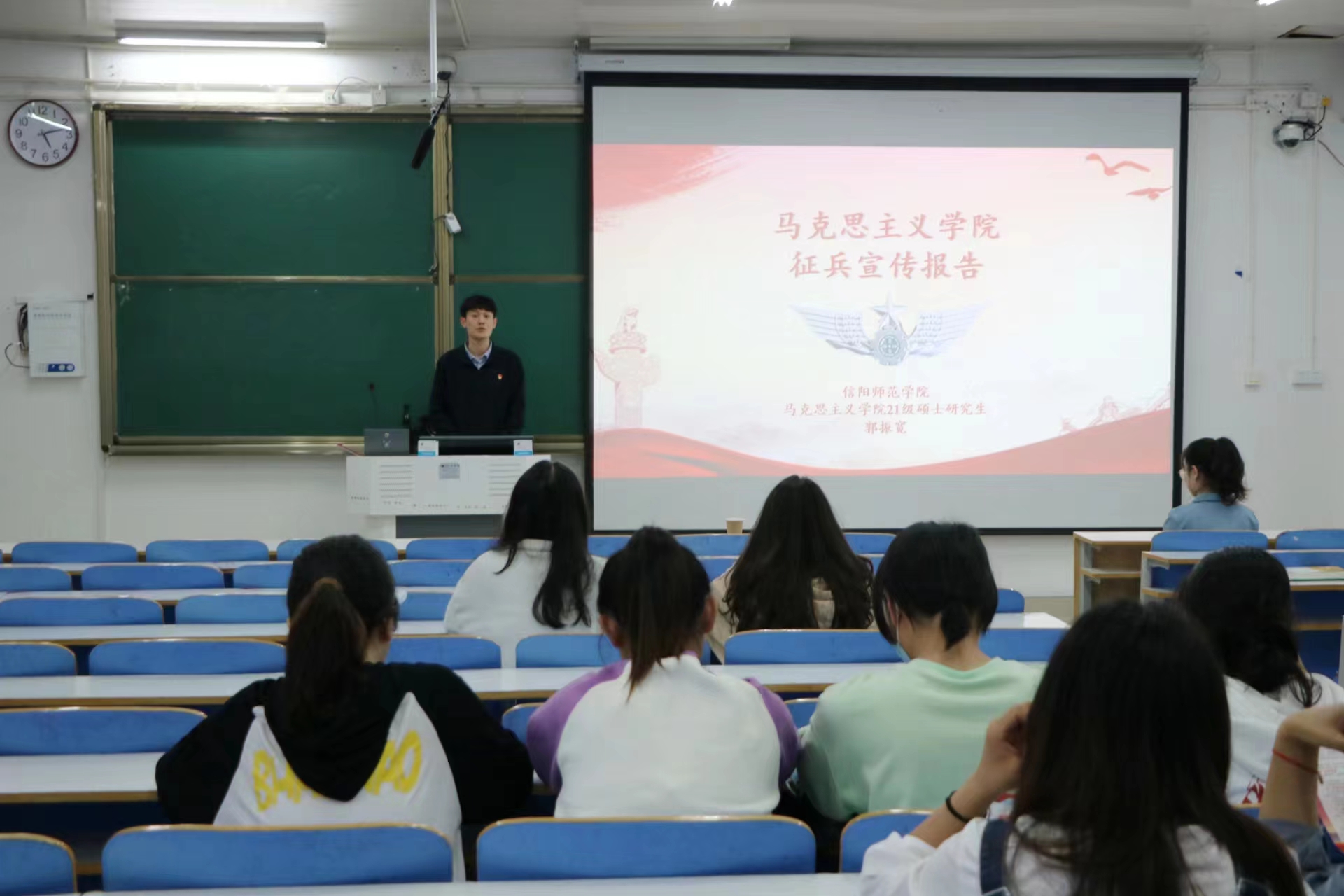 志存高远砺青春,建功立业赴军营。为进一步做好国家征兵政策宣传,将征兵工作融入立德树人教育环节,5月26日下午,sjb世俱杯网站在社科楼514教室召开征兵入伍宣讲会,团委老师高小佳、专职辅导员沈海蓄、优秀退伍大学生代表郭振宽和2019级毕业生共同参与此次宣讲会。会议由团委老师高小佳主持。