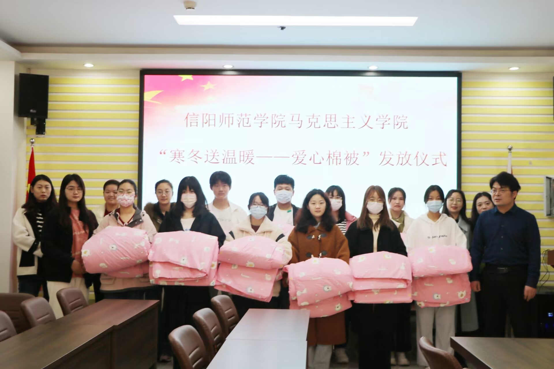 为切实做好家庭经济困难学生精准帮扶和资助育人工作,11月25日上午,sjb世俱杯网站在社科楼323会议室举行爱心棉被发放仪式。世俱杯官网党委书记朱四倍、团委老师高小佳、班主任王明园、杨春艳、 吴梦云、周钰婷及受资助学生共同参加此次仪式。仪式由朱四倍主持。