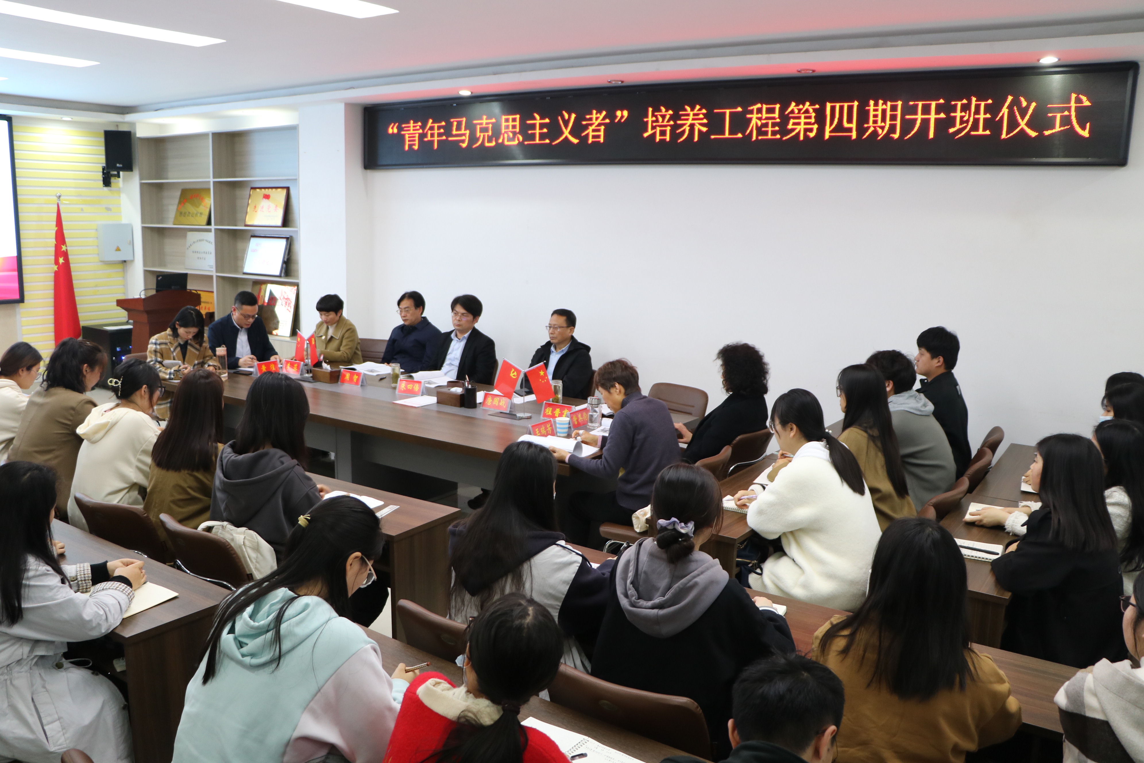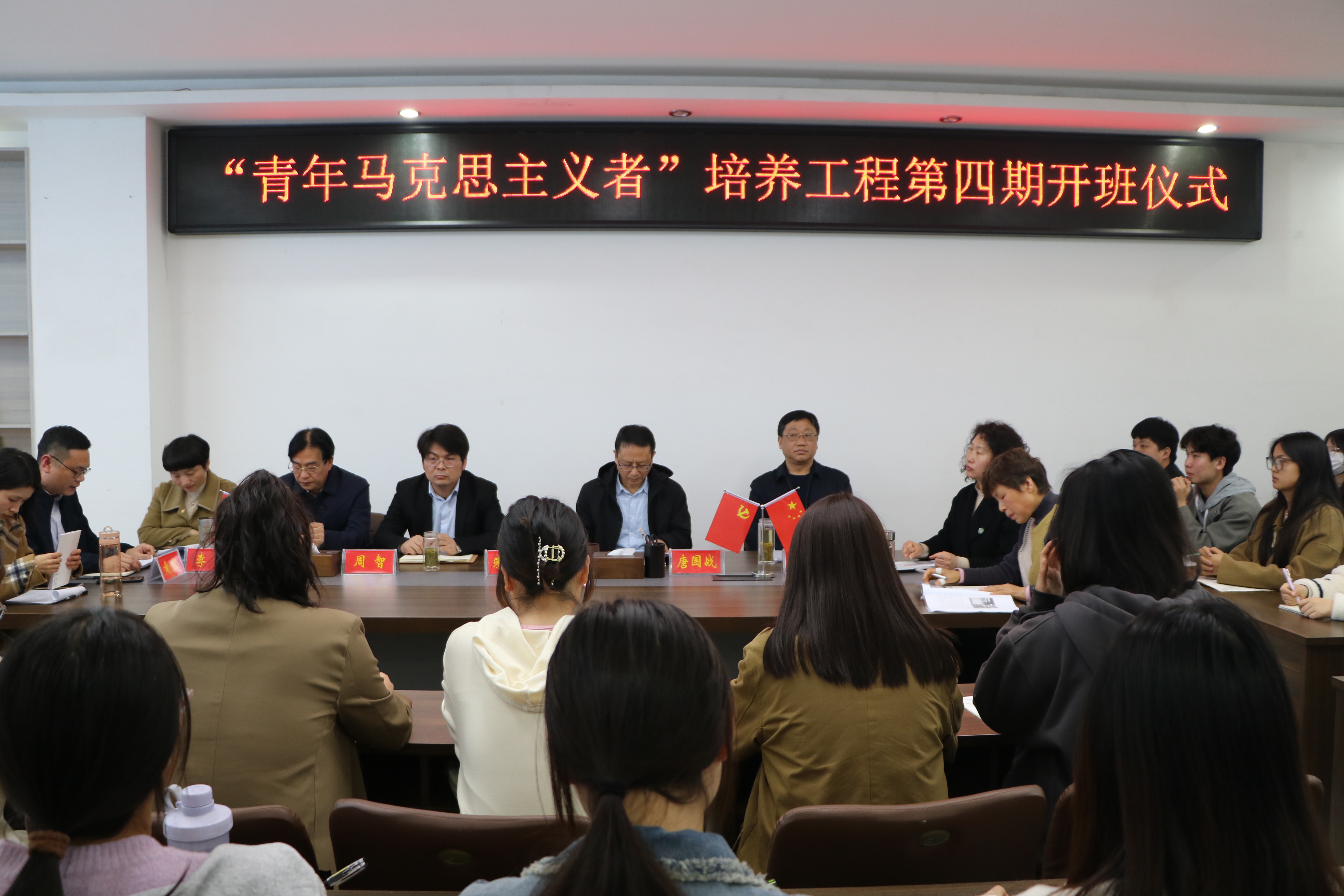 10月12日下午,sjb世俱杯网站在社科楼323会议室举办第四期“青年马克思主义者”培养工程开班仪式。学院全体领导班子成员、授课教师代表王瑞芳、专职组织员任婷以及第四期32位青马工程学员共同参加本次开班仪式。仪式由党委副书记黄煌主持。